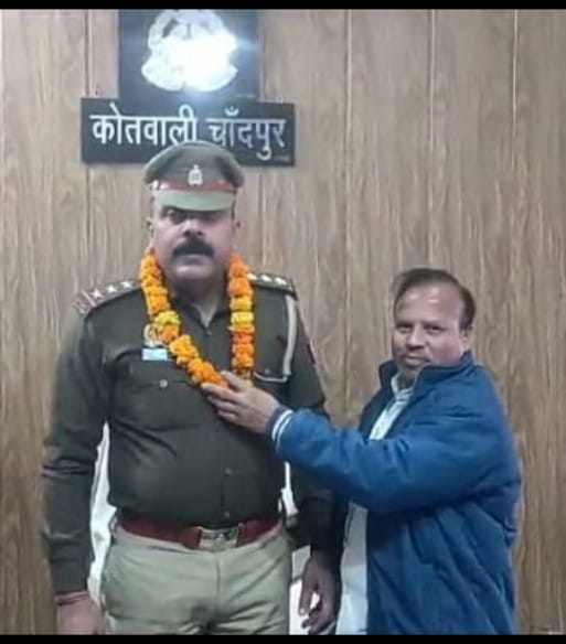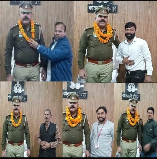 पुलिस मुख्यालय से आदेश जारी होने के बाद संजय कुमार थाना कोतवाली चांदपुर का कार्यभार संभालते ही अपराध नियंत्रण व अपराधियों पर नकेल कसने का कार्य पहले दिन से ही शुरू कर दिया। थाना कोतवाली चांदपुर क्षेत्र से जुड़े विभिन्न समाचार पत्रों व न्यूज़ चैनलों मे अपनी सेवाएं दे रहे पत्रकार इरफान अंसारी , पत्रकार आफताब आलम , पत्रकार भुवन राजपूत , पत्रकार डॉ मुनेश चंद शर्मा , कैमरा पर्सन शाहरुख इदरीस ने नवागत थाना प्रभारी संजय कुमार का फूल माला पहनाकर जोरदार स्वागत किया । और हार्दिक बधाई एवं शुभकामनाएं दी ।सभी पत्रकारों ने नवागत थाना प्रभारी से अपेक्षा की है कि वह क्षेत्र में कानून / सुरक्षा व शांति / व्यवस्था को मजबूती प्रदान करेंगे।
