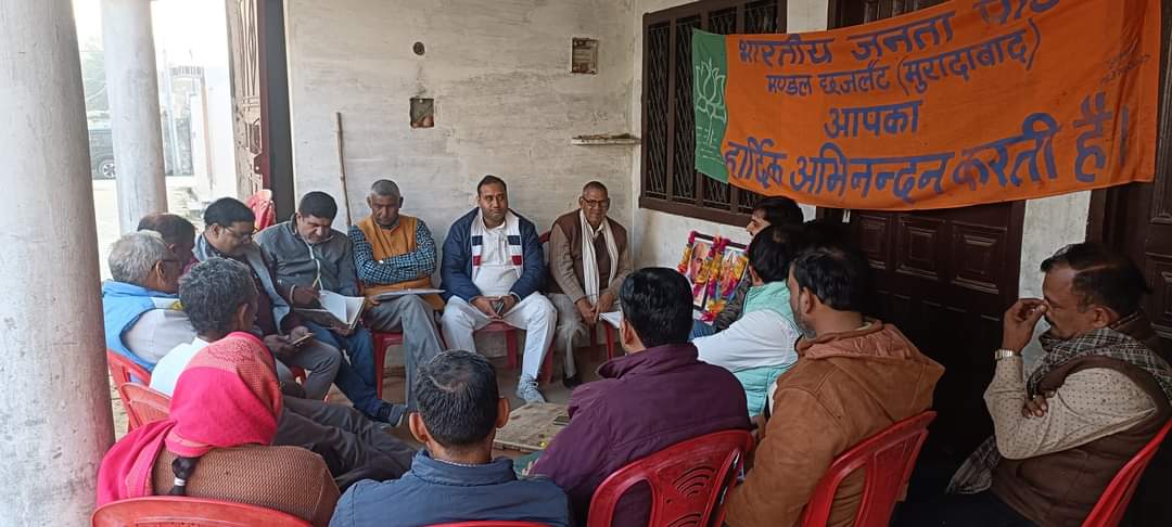 कांठ,मुरादाबाद (परिपाटी न्यूज़)विधानसभा कांठ मंडल छजलैट के गांव रम्पुरा छजलैट मे शक्ति केन्द्र संयोजक शौवीर सिहं के निवास स्थान पर नमो एप संबंधित मंडल स्तरीय बैठक हुई बैठक में मुख्य अतिथि भाजपा नमो एप के जिला संयोजक महामंत्री हरज्ञान सिंह एवं जिला महामंत्री राजन बिश्रोई ,चकित चौधरी जिला मंत्री ,संजय ढाका जिला मीडिया प्रभारी यप डाउनलोड करने के संबंध में मंडल कार्यकारिणी शक्ति केंद्र संयोजक