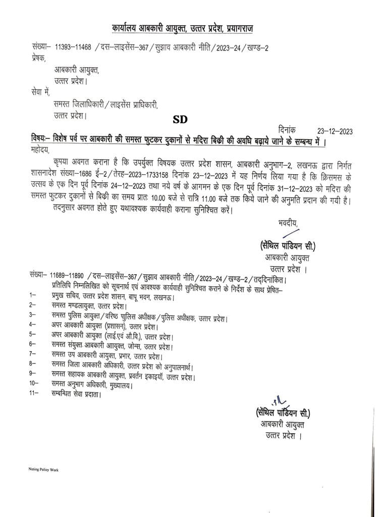 बिजनौर( परिपाटी न्यूज़)। उत्तर प्रदेश सरकार के आबकारी आयुक्त सेंथिल पांडियन सी ने नववर्ष और क्रिसमस डे अवसर को देखते हुए पूर्व रात्रि पर शराब की बिक्री को 11 बजे तक परमिशन प्रदान की है। आपको बतादे कि भारत ही नहीं अपितु सम्पूर्ण विश्व भर में नववर्ष और क्रिसमस का उत्सव धूमधाम से मनाया जाता है और उस दिन ज्यादातर लोग मदिरापान आदि कर मनोरंजन करते हैं।