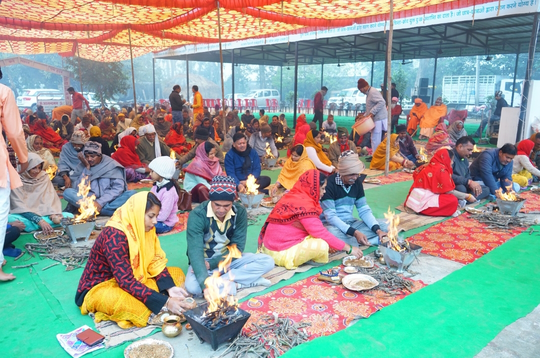 कुण्डीय कर दैनिक हवन अग्निहोत्र करने के लिए प्रेरित किया। कार्यक्रम का शुभारंभ गुरुकुल मुंढाल से आए रामुनि आर्य एवं जयप्रकाश आर्य के मार्गदर्शन में वैदिक मित्रों से हुआ। अलग-अलग यज्ञ बेदी पर दंपति जोड़े ने घृत एवं पुष्टि कारक, रोग नाशक, सुगंधीत वर्धक सामग्री की आहुति दी इस अवसर पर योगाचार्य प्रकाश चन्द ने कहा कि इतिहास की ओर दृष्टि डालें तो भगवान राम, भगवान कृष्ण ,राजा महाराजा ,ऋषि मुनि एवं ग्रामवासी दैनिक यज्ञ किया करते थे, हम स्वयं पिछले 1 वर्ष से दैनिक यज्ञ करते हैं उन्होंने कहा कि हर प्रकार का सुख, स्वस्थ, समृद्धि के लिए यज्ञ का महत्वपूर्ण योगदान है, इससे जड़, चेतन 33 कोटि देवता पुष्ट एवं प्रसन्न होकर धर्म ,अर्थ, काम और मोक्ष ईश्वर प्राप्ति में सहयोग करते हैं, योग शिक्षक प्रकाश ने अल्प सहयोग दान राशि लेकर दंपति जोड़ों को हवन बेदी उपलब्ध कराकर अग्निहोत्र करने की प्रेरणा दी सेवा धाम आश्रम के