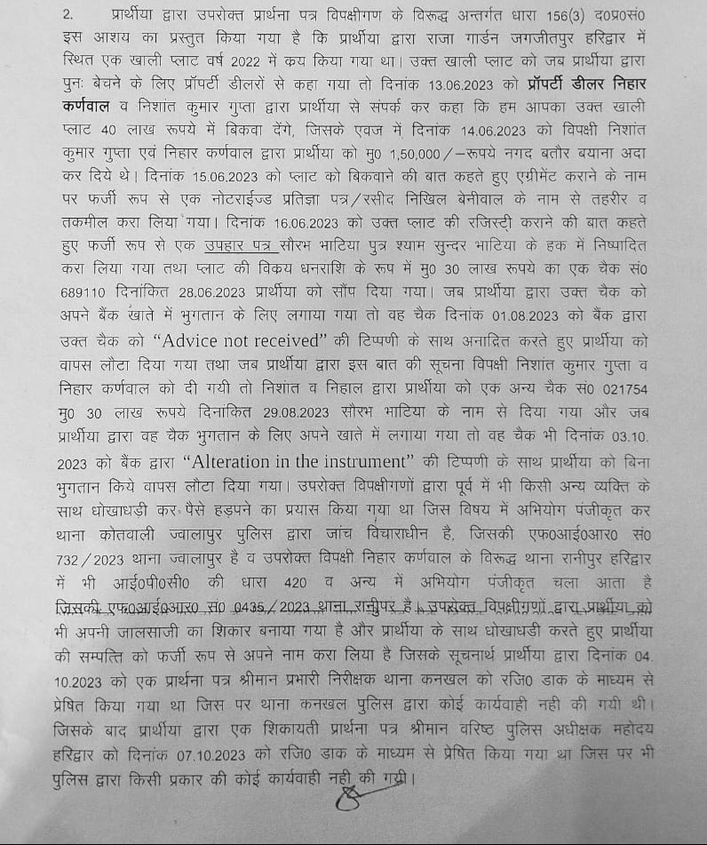 निखिल बेनीवाल के नाम से तहरीर व तकमील करा लिया गया।धोखाधड़ी के मामले में जूर्स कंट्री निवासी सौरभ भाटिया समेत तीन के विरुद्ध माननीय न्यायालय द्वारा मुकदमा दर्ज करने के दिए गए आदेश अधिवक्ता अभिषेक भारद्वाज के प्रार्थना पत्र पर संज्ञान लेते हुए न्यायालय ने लिया अहम फैसला लिया, दिनांक 16.06.2023 को उक्त प्लाट की रजिस्ट्री कराने की बात कहते हुए फर्जी रूप से एक उपहार पत्र सौरभ भाटिया पुत्र श्याम सुन्दर भाटिया के हक में निष्पादित करा लिया गया तथा प्लाट की विकय धनराशि के रूप में मु0 30 लाख रूपये का एक चैक सं० 689110 दिनांक 28.06.2023 व्यक्ति को सौंप दिया गया। जब प्रार्थीया द्वारा उक्त चैक को अपने बैंक खाते में भुगतान के लिए लगाया गया तो वह चैक दिनांक 01.08.2023 को बैंक द्वारा उक्त चैक की टिप्पणी के साथ अनादित करते हुए व्यक्ति को वापस लौटा दिया गया तथा जब व्यक्ति द्वारा इस बात की सूचना विपक्षी निशांत कुमार गुप्ता व निहार कर्णवाल को दी गयी तो निशांत व निहाल द्वारा व्यक्ति को एक अन्य चैक सं0 021754 मु० 30 लाख रूपये दिनाकित 29.08.2023 सौरभ भाटिया के नाम से दिया गया और जब व्यक्ति द्वारा वह चैक भुगतान के लिए अपने खाते में लगाया गया तो वह चैक भी दिनांक 03.10. 2023 को बैंक द्वारा “की टिप्पणी के साथ व्यक्ति को बिना भुगतान किये वापस लौटा दिया गया। उपरोक्त विपक्षीगणों द्वारा पूर्व में भी किसी अन्य व्यक्ति के साथ धोखाधड़ी कर पैसे हड़पने का प्रयास किया गया था जिस विषय में अभियोग पंजीकृत कर थाना कोतवाली ज्वालापुर पुलिस द्वारा जांच विचाराधीन है। उपरोक्त विपक्षीगणों द्वारा व्यक्ति को भी अपनी जालसाजी का शिकार बनाया गया है और प्रार्थीया के साथ धोखाधड़ी करते हुए व्यक्ति की सम्पत्ति को फर्जी रूप से अपने नाम करा लिया है जिसके सूचनार्थ प्रार्थीया द्वारा दिनांक 04. 10.2023 को एक प्रार्थना पत्र प्रभारी निरीक्षक थाना कनखल को रजि० डाक के माध्यम से प्रेषित किया गया था जिस पर थाना कनखल पुलिस द्वारा कोई कार्यवाही नहीं की गयी थी। जिसके बाद प्रार्थीया द्वारा एक शिकायती प्रार्थना पत्र वरिष्ठ पुलिस अधीक्षक महोदय हरिद्वार को दिनांक 07.10.2023 को रजि० डाक के माध्यम से प्रेषित किया गया था जिस पर भी पुलिस द्वारा किसी प्रकार की कोई कार्यवाही नहीं की गयी।