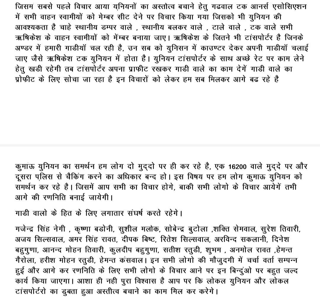 युनियन टांसपोर्टर के साथ अच्छे रेट पर काम लेने हेतु खडी रहेगी तब टांसपोर्टर अपना प्राफीट रखकर गाडी वाले का काम देगें गाडी वाले का प्रोफीट के लिए सोचा जा रहा है इन विचारों को लेकर हम सब मिलकर आगे बढ रहे है। कुमाऊ युनियन का समर्थन हम लोग दो मुद्दो पर ही कर रहे है, एक 16200 वाले मुद्दे पर और दूसरा पलिस से चैकिंग करने का अधिकार बन्द हो। इस विषय पर हम लोग कुमाऊ युनियन को समर्थन कर रहे है। जिसमें आप सभी का विचार होगे, बाकी सभी लोगो के विचार आयेगें तभी आगे की रणनिति बनाई जायेगी।गाडी वालो के हित के लिए लगातार संघर्ष करते रहेगे ,गजेन्द्र सिंह नेगी, कृष्णा बडोनी, सुशील मलोक, सोबेन्द्र बुटोला, शक्ति सेमवाल, सुरेश तिवारी, अजय सिल्सवाल, अमर सिंह रावत, दीपक बिष्ट, रितेश सिल्सवाल, अरविन्द सकलानी, दिनेश बहुगुणा, आनन्द मोहन तिवारी, कुलदीप बहुगुणा, सतीश रतुडी, शुभम, अनमोल रावत, हेमन्त गैरोला, हरीश मोहन रतुडी, हेमन्त कंसवाल। इन सभी लोगो की मौजूदगी में चर्चा वर्ता सम्पन्न हुई और आगे कर रणनिति के लिए सभी लोगो के विचार आने पर इन बिन्दुओ पर बहुत जल्द कार्य किया जाएगा। आशा ही नही पुरा विश्वास है आप पर कि लोकल युनियन और लोकल टांसपोर्टरो का डुबता हुआ अस्तीत्व बचाने का काम मिल कर करेगे।