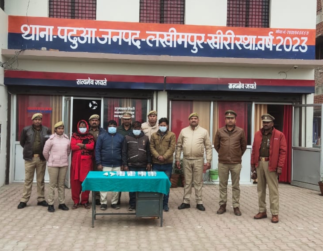 पुलिस अधीक्षक महोदय जनपद खीरी, गणेश प्रसाद साहा के कुशल निर्देशन एवं अपर पुलिस अधीक्षक खीरी व क्षेत्राधिकारी निघासन के निकट पर्यवेक्षण में स्वाट एवं सर्विलांस टीम जनपद खीरी की सहायता से अपराध की रोकथाम,चैकिंग संदिग्ध व्यक्ति,चैकिंग संदिग्ध वाहन व अपराध पर अंकुश लगाने हेतु चलाए जा रहे अभियान के अन्तर्गत दिनांक 14 जनवरी 2024 को थाना पढुआ पुलिस द्वारा डकैती किये गये पीली धातु व सफेद धातु के आभूषण व नकद 18,150 रुपया तथा अभियुक्त गण से बरामद 02 अदद तमंचा 315 बोर व 4 अदद जिंदा कारतूस 315 बोर व घटना में प्रयुक्त 02 अदद मोटर साईकिल एचएफ डिलेक्स व सुपर स्पेलेन्डर व एक अदद कार एक्सप्रेशो बरामद किया गया। अभियुक्त गण 1. अल्ताफ उर्फ लड्डन पुत्र कल्लू निवासी ग्राम बिरसिंहपुर थाना ईशानगर जनपद खीरी 2.विजयशंकर तिवारी पुत्र जमुनाप्रसाद तिवारी निवासी ग्राम करेहका ऊचगाँव थाना सकरन जनपद सीतापुर 3.राजमल पुत्र गिरवर लोनिया निवासी ग्राम बसौली थाना मोहम्मदपुर खाला जिला बाराबंकी को ढखेरवा धौरहरा की लिंक रोड ग्राम जम्हौरा से पढुआ रोड पर समय 03.50 बजे गिरफ्तार किया गया तथा अभियुक्त 4.गीता किन्नर निवासी धौरहरा थाना धौरहरा जनपद लखीमपुर खीरी को धौरहरा चौराहे से समय 10.12 बजे गिरफ्तार किया गया । जिसके सम्बन्ध में थाना स्थानीय पर पंजीकृत मु0अ0सं0 186/2023 धारा 395,412,120बी भादवि0 में अभियुक्त गण का चालान मा0 न्यायालय भेजा गया।