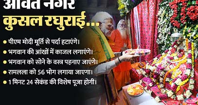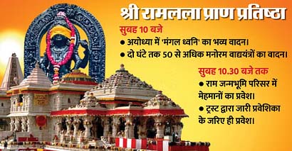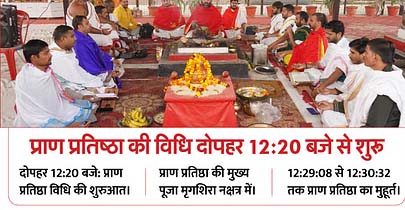 प्राण प्रतिष्ठा की विधि दोपहर 12:20 बजे से शुरूरामलला की प्राण प्रतिष्ठा की विधि 22 जनवरी को दोपहर 12:20 बजे शुरू होगी। प्राण प्रतिष्ठा की मुख्य पूजा अभिजीत मुहूर्त में की जाएगी। रामलला की प्राण प्रतिष्ठा का समय काशी के विद्वान गणेश्वर शास्त्री द्रविड़ ने निकाला है। यह कार्यक्रम पौष माह के द्वादशी तिथि (22 जनवरी 2024) को अभिजीत मुहूर्त, इंद्र योग, मृगशिरा नक्षत्र, मेष लग्न: प्राण प्रतिष्ठा पूरा होने के बाद संबोधन