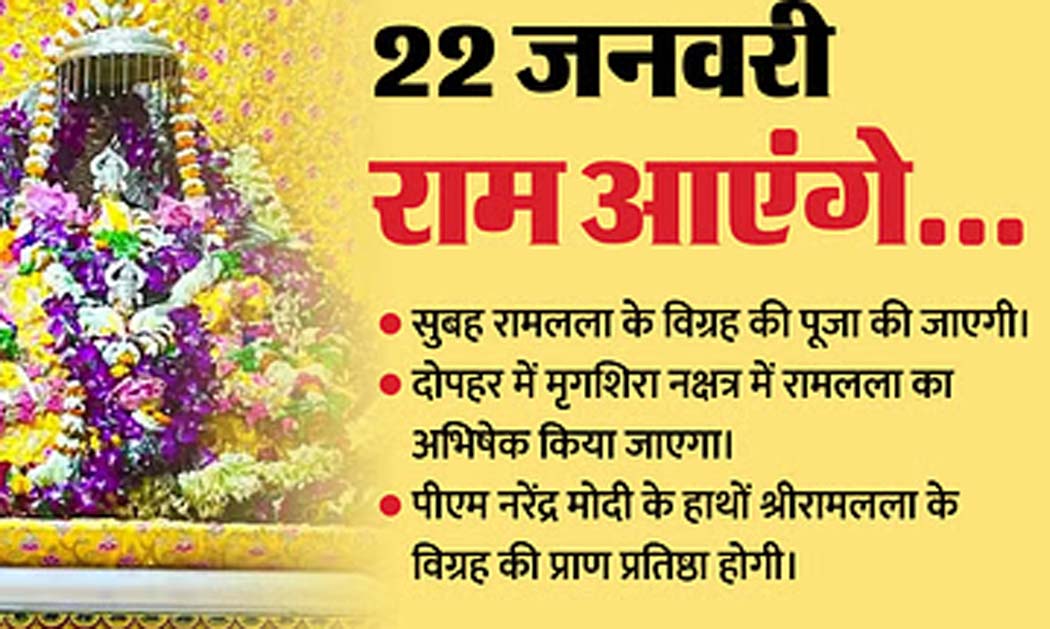 अयोध्या (परिपाटी न्यूज़) राम मंदिर की प्राण प्रतिष्ठा कार्यक्रम की सभी तैयारियां पूरी हैं। पूरी राम नगरी को आध्यात्मिक रंग देकर सजाया गया है। इसी के साथ रामलला के आगमन का इंतजार खत्म हो गया है। मंदिर परिसर की छटा देखती ही बनती है। इस कार्यक्रम में प्रधानमंत्री नरेंद्र मोदी, लोकप्रिय क्रिकेटर, मशहूर हस्तियां, उद्योगपति, संत और विभिन्न देशों के प्रतिनिधि शामिल होंगे। अब भारत समेत दुनिया की नजरें प्राण प्रतिष्ठा की ऐतिहासिक घड़ी पर टिकी हुई हैं।अब आइये जानते हैं कि प्राण प्रतिष्ठा का पूरा कार्यक्रम क्या है? विधि-अनुष्ठान कितने बजे से शुरू होंगे? मेहमान कब आएंगे? मुख्य कार्यक्रम कब होगा, प्राण प्रतिष्ठा की विधि दोपहर 12:20 बजे से शुरूरामलला की प्राण प्रतिष्ठा की विधि 22 जनवरी को दोपहर 12:20 बजे शुरू होगी। प्राण प्रतिष्ठा की मुख्य पूजा अभिजीत मुहूर्त में की जाएगी। रामलला की प्राण प्रतिष्ठा का समय काशी के विद्वान गणेश्वर शास्त्री द्रविड़ ने निकाला है। यह कार्यक्रम पौष माह के द्वादशी तिथि (22 जनवरी 2024) को अभिजीत मुहूर्त, इंद्र योग, मृगशिरा नक्षत्र, मेष लग्न एवं वृश्चिक नवांश में होगा।