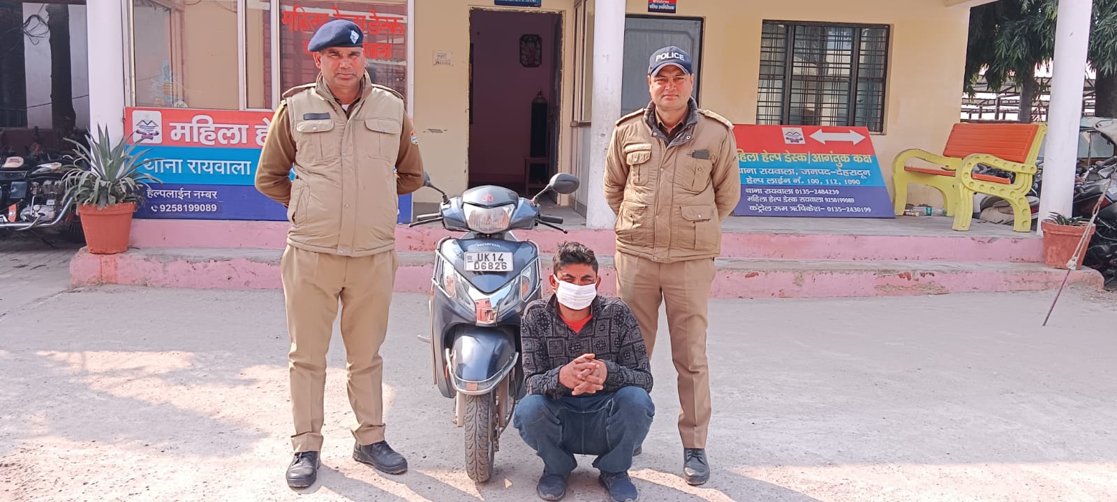 4/25 आर्म्स एक्ट ,थाना रायवाला ,बरामदगी का विवरण, चोरी की गयी स्कूटी संख्या UK14D-6826 एक्टीवा ग्रे कलर बरामद । अनुमानित किमत-95000/-रुपये, पुलिस टीम, उ0नि0 कुशाल सिह रावत ,थाना रायवाला, कानि0 1286 अमित सैनी ,थाना रायवाला ,कानि0 715 सन्दीप कुमार ,थाना रायवाला, उक्त घटना के सम्बन्ध मे वादी की लिखित तहरीर के आधार पर थाना रायवाला पर मु0अ0स0-14/24 धारा 379/411 भादवि पंजीकृत किया गया । अभियुक्त को समय से मा0न्यायालय पेश किया जा रहा है ।