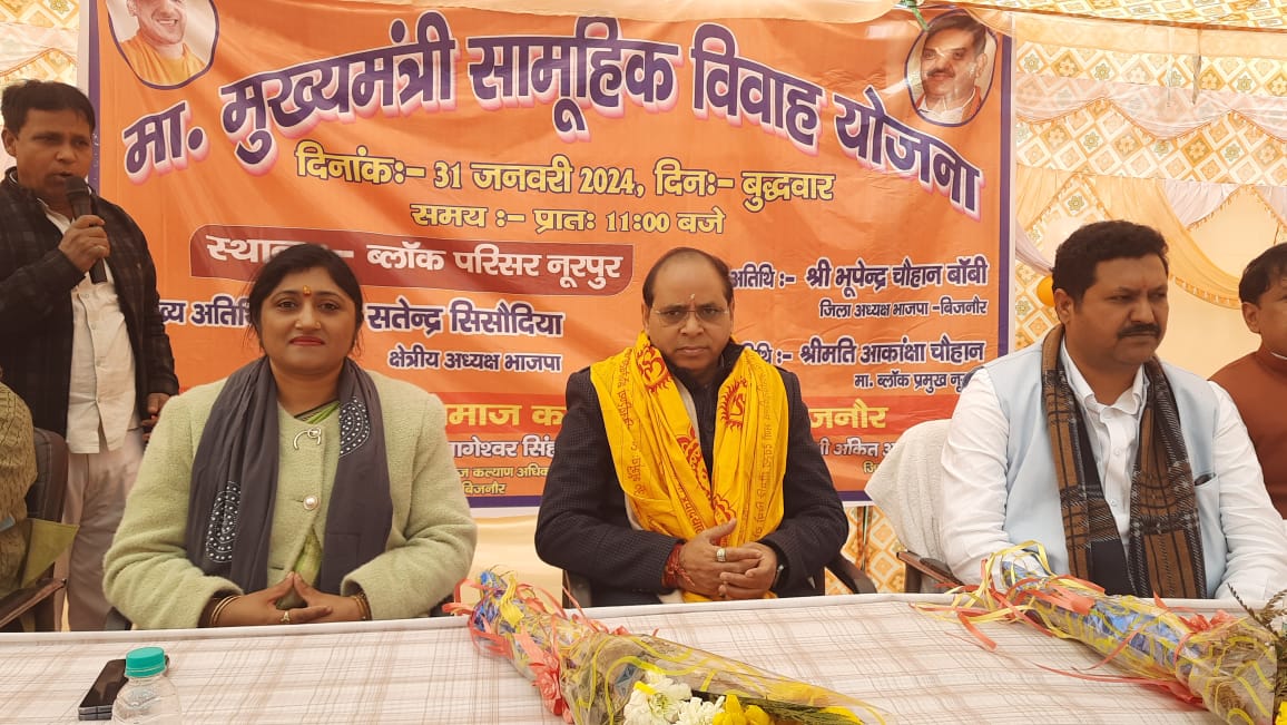 नूरपुर, बिजनौर (परिपाटी न्यूज़)ब्लॉक परिसर में मुख्यमंत्री सामूहिक विवाह योजना के अंतर्गत 136हिन्दू और 11मुस्लिम जोड़ों की शादी संपन्न हुई। सामूहिक विवाह के मुख्य अतिथि क्षेत्रीय अध्यक्ष भाजपा पश्चिम उत्तर प्रदेश सतेन्द्र सिसोदिया विशिष्ट अतिथि भाजपा जिला अध्यक्ष भूपेंद्र चौहान बॉबी एवं ब्लाक प्रमुख आकांक्षा चौहान ने दीप प्रचलित कर कार्यक्रम का शुभारंभ किया। मुख्य अतिथि भाजपा पश्चिमी उत्तर प्रदेश सतेन्द्र सिसोदिया ने सभी विवाहित जोड़ों को बधाई देते हुए प्रदेश सरकार के मुख्यमंत्री योगी