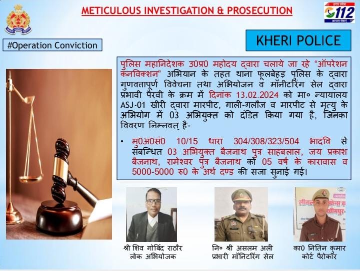लखीमपुर खीरी परिपाटी न्यूज। उत्तर प्रदेश शासन की मंशा के अनुरूप जनपद लखीमपुर खीरी पुलिस द्वारा आपरेशन कन्विक्शन के तहत अपराधियों के विरुद्ध प्रभावी कार्यवाही व पैरवी के क्रम मे आज दिनांक 13.02.2024 को 04 मामलो मे माननीय न्यायालय खीरी द्वारा दण्डित किया गया है सजा का विवरण निम्नवत है-1.वर्ष 2015 में थाना *फूलबेहड़* जनपद खीरी पर *अभि0गण 1. बैजनाथ पुत्र साहबलाल 2. जय प्रकाश बैजनाथ 3. रामेश्वर पुत्र बैजनाथ नि0गण पाण्डेपुरवा म0 बसहाभूड़ थाना फूलबेहड़ जनपद खीरी * के द्वारा वादी, वादी के पिता ब्रम्हादीन, माता शान्ती
