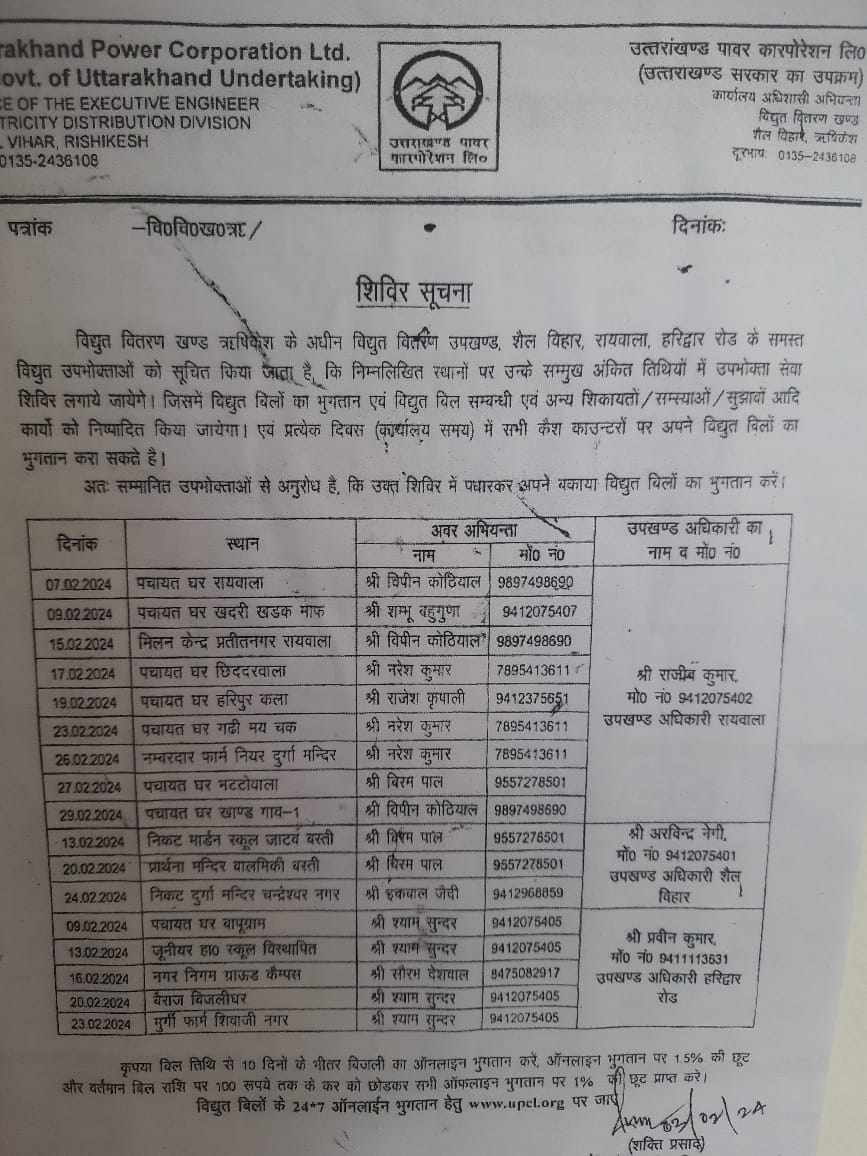ऋषिकेश परिपाटी न्यूज। कार्यालय अधिशासी अभियन्ता विद्युत वितरण खण्ड शैल विहार, ऋधिजेश दूरभाष 0:35-2436108, उराराखंड पावर कॉर्पोरेशन लिमिटेड, शिविर सूचना विद्युत वितरण खण्ड ऋषिकेश के अधीन विद्युत वितरण उपखण्ड, शैल विहार, रायवाला, हरिद्वार रोड के समस्त विद्युत उपभोक्ताओं को सूचित किया जाता है कि निम्नलिखित स्थानों पर उन्के सम्मुख अंकित तिथियों में उपभोक्ता संवा शिविर लगाये जायेगे। जिसमें विद्युत बिलों का भुगतान एवं विद्युत बिल सम्बन्धी एवं अन्य शिकायतों / सम्स्याओं / सुझावों