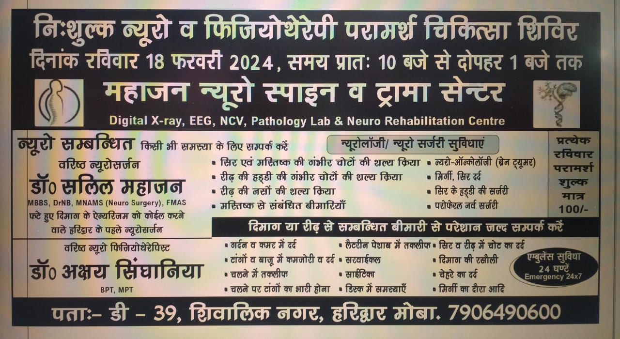 हरिद्वार ( परिपाटी न्यूज़)। शिवालिक नगर, रविवार 18 फरवरी 2024 समय 10:00 बजे से दोपहर 1:00 बजे तक का फ्री इलाज किया गया। महाजन न्यूरोस्पाइन व ट्रामा सेंटर में लगाया गया।
