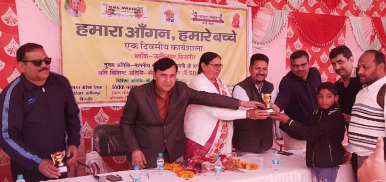 चान्दपुर बिजनौर (परिपाटी न्यूज)। जिला बिजनौर के चान्दपुर में कंपोजिट विद्यालय पतियापाड़ा के स्कूल परिसर में बेसिक शिक्षा विभाग द्वारा। ब्लॉक संसाधन केंद्र पर हमारा आंगन-हमारे बच्चे शीर्षक से उत्सव आयोजन किया गया। जिसमें समस्त स्कूलों से 5-5 निपुण छात्रों को उनके निपुणता की दक्षता प्राप्त कर लेने पर पुरस्कृत करते हुए सम्मानित भी किया गया। इस उत्सव पूर्वक आयोजित किए गए कार्यक्रम की अध्यक्षता कुंतेश देवी ब्लॉक प्रमुख जलीलपुर द्वारा की गई। इस कार्यक्रम में विशिष्ट अतिथि के रूप में खंड शिक्षा अधिकारी जलीलपुर ओमवीर सिंह रहे।