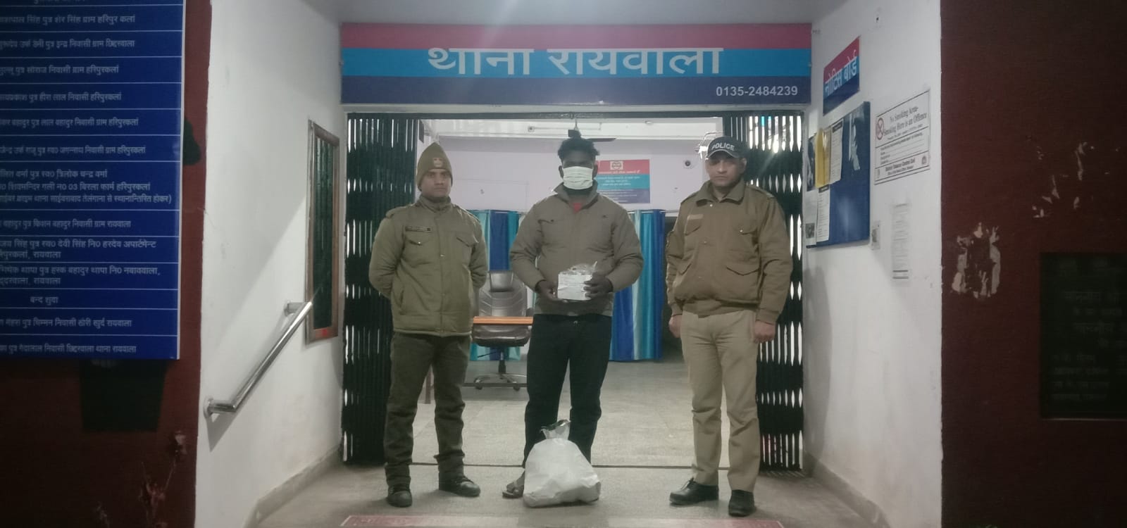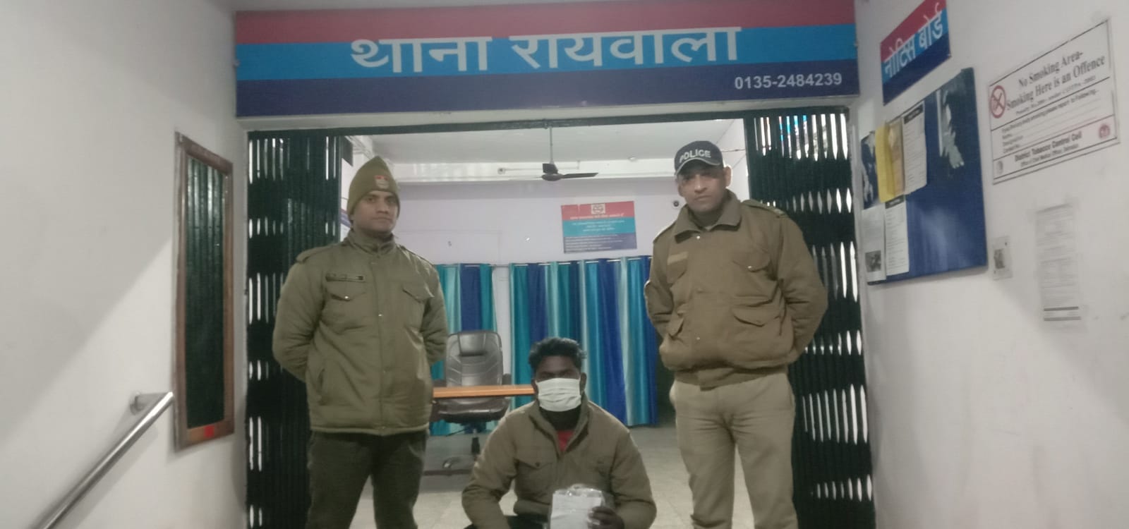 कानि0 755 कृष्ण प्रकाश , कानि0 1166 सुनील, थाना रायवाला पर गठित पुलिस टीम द्वारा अभियान के अनुपालन में दिनांक 11.03.24 को रात्रि के समय एक नफर अभियुक्त को पंचकुला भवन स्टील खोके के पास हरिपुरकला से देशी शराब जाफरान के साथ गिरफ्तार किया गया अभियुक्त के विरुद्ध थाना हाजा पर मु0अ0स0 49 /2024 धारा 60 आबकारी अधि0 पंजीकृत किया गया ।