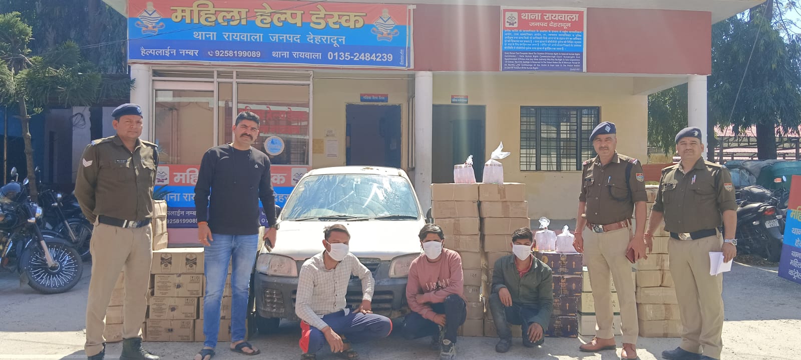 देहरादून पुलिस द्वारा चलाए जा रहे अभियान को सफल बनाने के क्रम में सहायक पुलिस अधीक्षक /थाना प्रभारी रायवाला जितेन्द्र चौधरी (I.P.S) के निर्देशन मे थाना रायवाला पुलिस पर टीमो का गठन किया गया । थाना रायवाला पर गठित पुलिस टीम द्वारा दिनांक 20.03.2024 को मुखबिर की सूचना पर रात्रि के समय तीन पानी पुलिया के अण्डर पास निर्मल अस्पताल से जाने वाली पुरानी रोड रायवाला के पास से बिना नम्बर की आल्टो कार सलेटी कलर सहीत 03 अभियुक्तगणो को 35 पेटी देशी शराब जाफरान व 16 पेटी अंग्रेजी शराब को अवैध रुप से परिवहन करते हुये गिरफ्तार किया । गिरफ्तार अभियुक्तगणो के विरुद्ध थाना