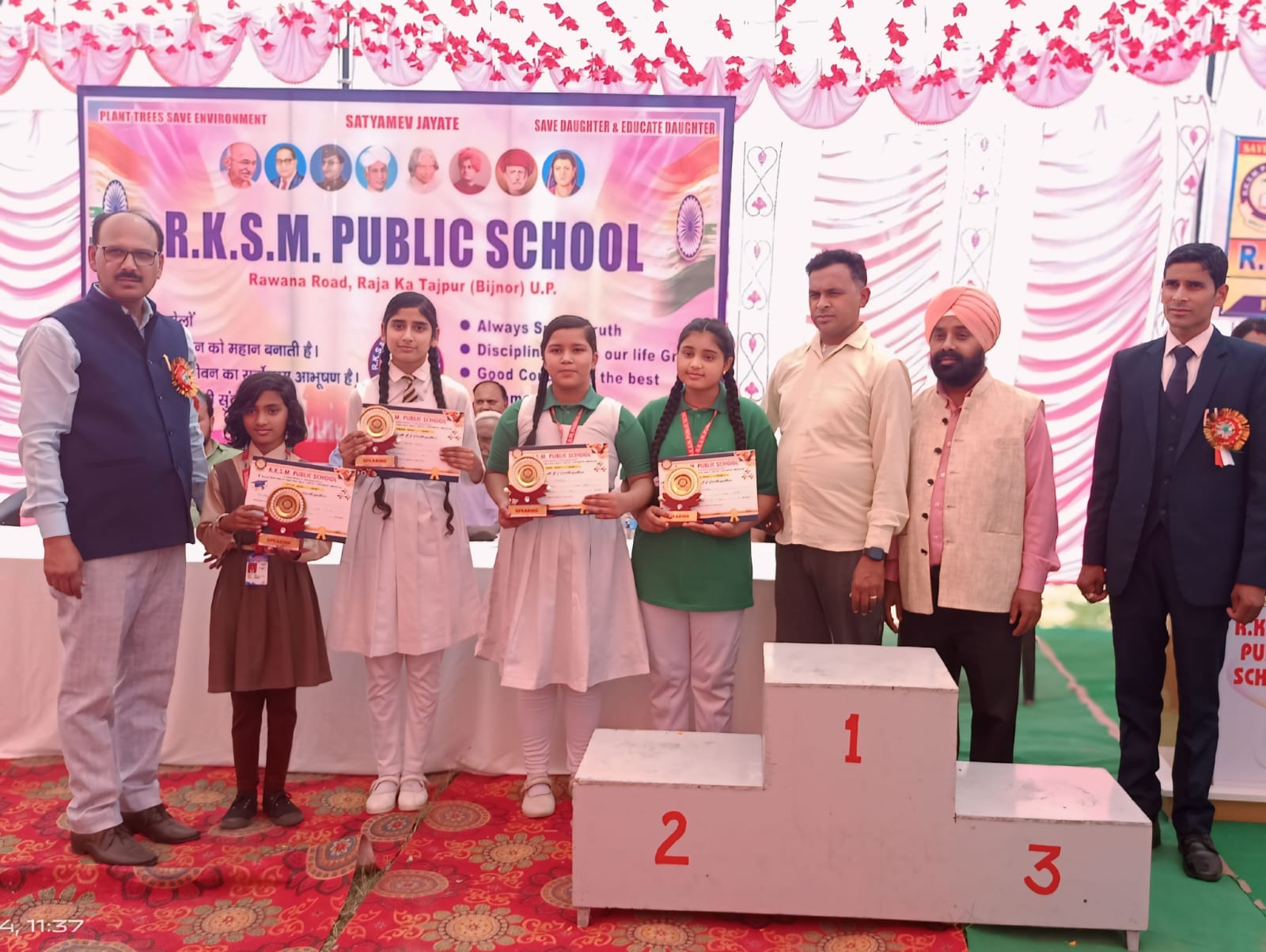 कक्षा में प्रथम, द्वितीय, तृतीय स्थान प्राप्त किया। जूनियर वर्ग कक्षा 6 में हमज़ा,आक़िफ़ नसीम,यशवी ,कक्षा 7 में नैना चौहान, आरोही,अपूर्व,सुहानी त्यागी,इंसा नूर,सक्षम गुप्ता, कक्षा 8 में तुषार यादव,कृतिका, महिमा सैनी, ने अपनी अपनी कक्षा में प्रथम,द्वितीय, तृतीय स्थान प्राप्त किया।कार्यक्रम में प्रबंधक बलराम सिंह, जिला पंचायत सदस्य इमरान अहमद,डॉ अरुण अग्रवाल, कोऑर्डिनेटर कमलजीत सिंह नूर, दिनेश कुमार, सुशील कुमार, धर्मेंद्र कुमार, लईक अहमद ने मेधावी बच्चों को पुरुष्कार देकर सम्मानित किया।