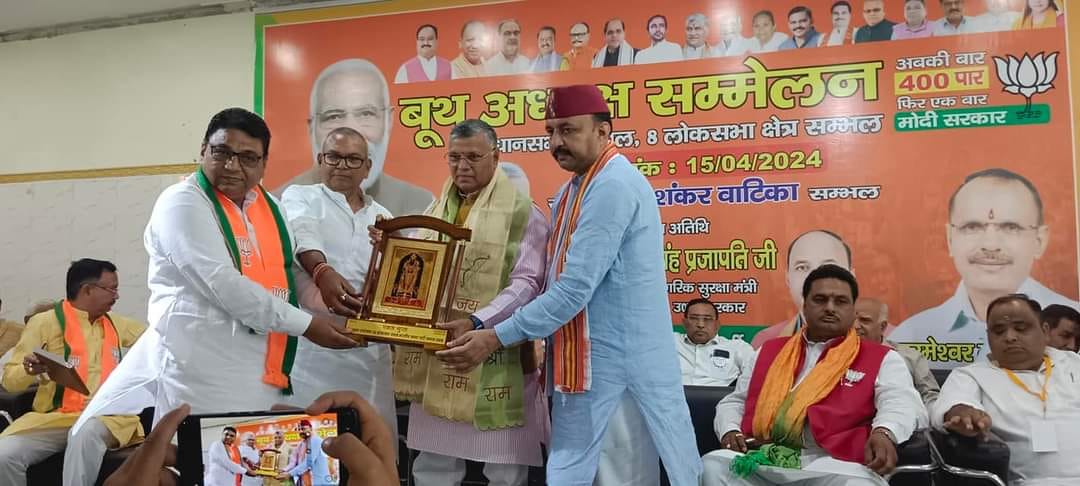प्रत्याशी परमेश्वर लाल सैनी जी ने कहा कि मैं तो सदैव एक क्रायकर्ता की तरह ही कार्य करता रहूंगा संभल के विकास के लिए में कोई कसर नहीं छोडूंगा इस बार संभल में कमल खिलेगा यह सब आपकी ही मेहनत से होगा मोदी जी तीसरी बार प्रधानमंत्री बनेंगे माननीय धरमवीर सिंह प्रजापति जी ने बूथअध्यक्षो को संबोधित करते हुए कहा कि आप लोगों की बजह से आपके परिश्रम एवम प्रयासों से देश व प्रदेश में भारतीय जनता पार्टी की सरकार है हमने सबका साथ सबका विकास सबका बिस्वास के साथ कार्य किया इस बार भरोसा नहीं अबकी बार मोदी जी की गारंटी है जो विकास पिछले 10 वर्षो में किया गया है उससे पूरे देश में आज मोदी जी की लहर दौड़ रही है समाजवादी की सरकार में माफिया व गुंडों का राज था लेकिन आज ऐसा नहीं है आज रामराज है बिना किसी डर के जनता आज जान रही है कि यह केवल मोदी जी व योगी जी के राज में संभव है बूथ अध्यक्ष पन्ना प्रमुखों के साथ में दिन रात मेहनत करते हैं आपकी पहचान भारतीय जनता पार्टी है शत प्रतिशत हमारे बूथ अध्यक्ष अपने अपने बूथ के लाभार्थियों से संपर्क करके अपने बूथ पर पहले से अधिक मत लेकर पार्टी के लिये विजय श्री दिलाएंगे जिला अध्यक्ष चौधरी हरेंद्र सिंह जी ने कहा कि हमे अबकी बार 400 पार करना है यह तभी संभव ही जब हम सभी मिलकर ज्यादा से ज्यादा वोट डलवाकर अपना वोट प्रतिशत बड़ाने का प्रयास करेंगे हमे इस बार 2014 की तरह संभल में कमल खिलाकर परमेश्वर लाल सैनी जी को सांसद बनाना है इसके लिए हमे घर घर जाकर संपर्क करना होगा सम्मेलन की अध्यक्षता जिला अध्यक्ष चौधरी हरेन्द्र सिंह जी ने तथा संचालन विधान सभा सह संयोजक गोपाल शर्मा ने किया इस दौरान सम्मेलन में लोकसभा प्रभारी राकेश चोहनजी, लोकसभा संयोजक पंकज गुप्ता जी, सह संयोजक भुवनेश राघव जी, चेत्रीय उपाध्यक्ष राजेश सिंघल जी, जिला पंचायत अध्यक्ष डाक्टर अनामिका यादव, कमल।मलिक जी, गुलफाम यादव, राज वहादुर जी, इमरान तुर्की, विनय गुप्ता, डाक्टर अरविंद, राज बहादुर सैनी, परीक्षित मोगिया,अर्जुन वाल्मीकि , प्रभार शर्मा, विपिन गुप्ता, जयप्रकाश गुप्ता, मुकुल रस्तोगी, देवेंद्र चौधरी, गणेश शर्मा, तेजपाल सेनी, शोभित गुप्ता, विनय चौधरी, अंकुश ठाकुर, गोतमजी,सुशील शर्मा, दानिश अली, इकराम अंसारी, गुलजार अंसारी, अतीक, खुर्शीदा बेगम, प्रवीन जहा रजवित सिंह बूथ अध्यक्ष, सक्ति केंद्र संयोजक, सक्ति केंद्र प्रभारी सहित लोग उपस्थित रहे।