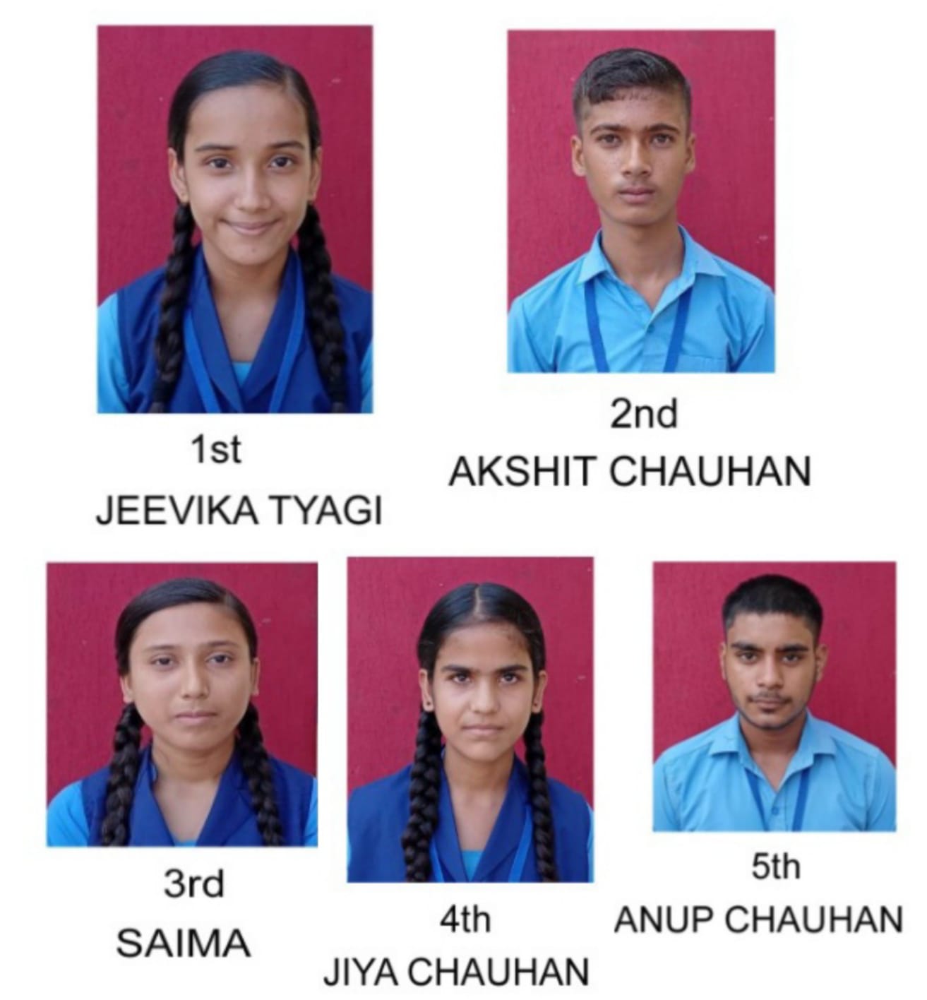 जिया चौहान ने 84.33% अंक पाकर चतुर्थ स्थान तथा अनूप चौहान ने 82.66% अंक प्राप्त कर पांचवें स्थान पर रहे। स्कूल का परीक्षा परिणाम 100 प्रतिशत रहा। स्कूल स्टाफ ने उपरोक्त सभी छात्र-छात्राओं को शुभकामनाएं देते हुए उनके उज्जवल भविष्य की शुभकामनाएं दी।