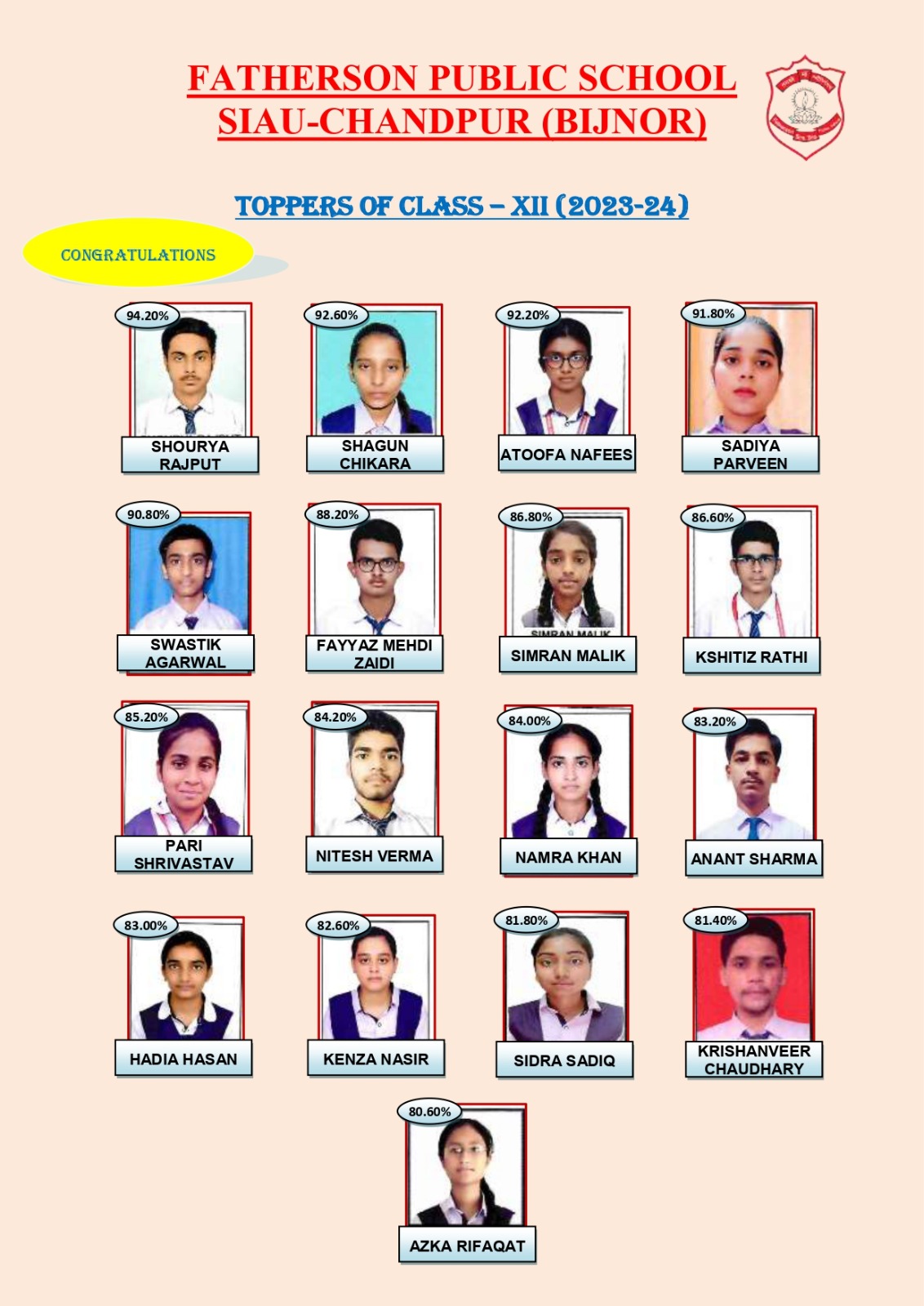 चांदपुर, बिजनौर (परिपाटी न्यूज़)सीबीएसई द्वारा रिजल्ट घोषित इंटरमीडिएट 2023 -24 के परीक्षा परिणाम फलस्वरूप फादरसन सीनियर सेकेंडरी पब्लिक स्कूल का परिणाम अतयंत सराहनीय रहा। विद्यालय का कुल परीक्षा परिणाम 91% रहा। विद्यालय के इन्टरमीडिएट विज्ञान वर्ग के शौर्य राजपूत ने 94.2% अंकों के साथ प्रथम स्थान प्राप्त किया। इसी क्रम में 92.6%अंक प्राप्त कर विज्ञान वर्ग के शगुन चिकारा द्वित्य स्थान पर रहे।