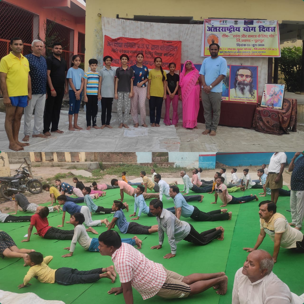 राजा का ताजपुर, बिजनौर (परिपाटी न्यूज़) गोरी शंकर सरस्वती शिशु मंदिर में नेहरु युवा केंद्र बिजनौर (युवा कार्यक्रम एवं खेल मंत्रालय भारत सरकार) के सौजन्य से अंतरराष्ट्रीय योग दिवस मनाया गया ।जिसमें योग शिक्षक प्रधानाचार्य शिवकुमार ने सभी प्रतिभागियों को आसन योग व प्राणायाम कराएं और उनके महत्व पर प्रकाश डाला इस अवसर पर शुभम वालिया ने बताया कि इस वर्ष की अंतरराष्ट्रीय योग दिवस की थीम “स्वयं और