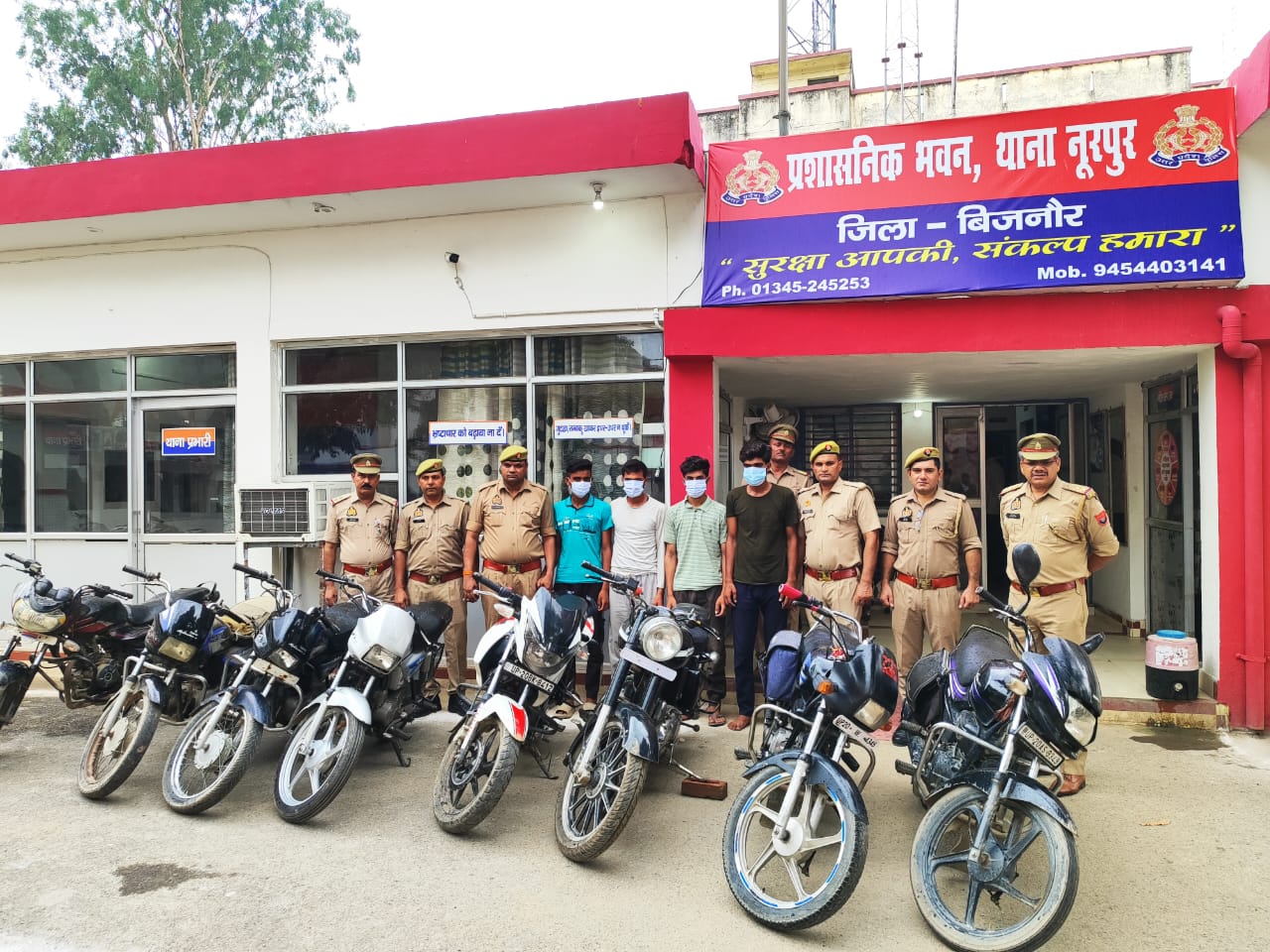 थाना क्षेत्र में पिछले कुछ दिनों में मोटरसाइकिल चोरी की कई घटना घटित हो चुकी है। जिसको लेकर पुलिस काफी गंभीर थी टीमें गठित कर घटना में संलिप्त अपराधियों एवं चोरी गई मोटरसाइकिलों की तलाश की जा रही थी। 30 जून की रात्रि थाना क्षेत्रांतर्गत गांव कुंडा बलदाना से आगे दाहिने हाथ की तरह खटाई रोड पर एक बंद पड़े ईंट भट्ठे के पास चोरी की 8 मोटरसाइकिल सहित चार व्यक्ति अनंत राठी उर्फ देशी पुत्र मनोज राठी निवासी ग्राम बिराल थाना चांदपुर, अमन यादव उर्फ शेर पुत्र श्रवण यादव निवासी ग्राम खजूरी थाना नूरपुर, रितिक यादव पुत्र छत्रपाल यादव निवासी ग्राम धुंधली