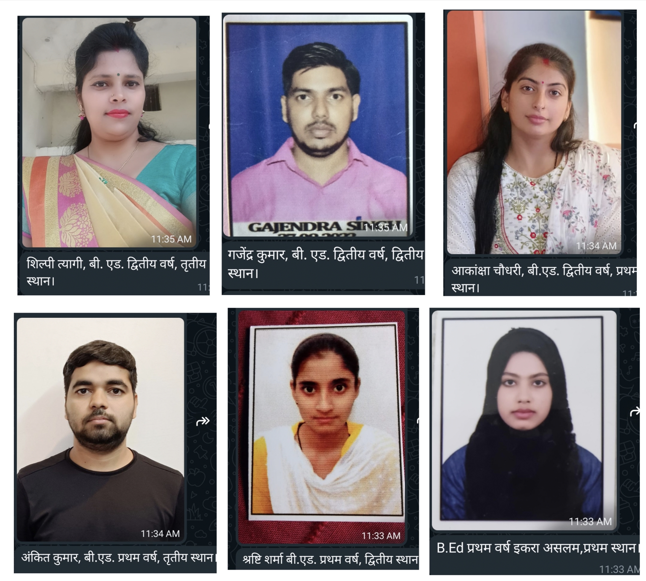 चांदपुर, बिजनौर (परिपाटी न्यूज़)शकुंतला महाविद्यालय चांदपुर का बी.एड. प्रथम व द्वितीय वर्ष का परीक्षा परिणाम एम.जे.पी. रूहेलखंड विश्वविद्यालय बरेली द्वारा घोषित किया गया । परीक्षा परिणाम शत प्रतिशत रहा ।बीएड प्रथम वर्ष में इकरा असलम ने 77.4 प्रतिशत अंक प्राप्त करके प्रथम स्थान, सृष्टि शर्मा ने 76.28 अंक प्राप्त कर द्वितीय स्थान ,अंकित कुमार ने 75.85 अंक प्राप्त करके तृतीय स्थान प्राप्त किया । B.Ed द्वितीय वर्ष में आकांक्षा चौधरी ने 80.25% प्राप्त करके प्रथम