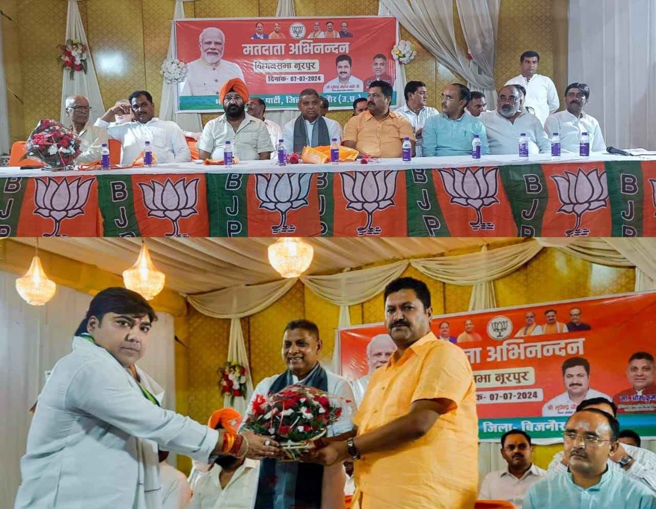 नगर के परी गार्डन में आयोजित मतदाता अभिनंदन समारोह की अध्यक्षता जिला अध्यक्ष भूपेंद्र सिंह बॉबी ने की कार्यक्रम के मुख्य अतिथि नहटौर विधानसभा के विधायक ओम कुमार रहे। कार्यक्रम की विधिवत शुरुआत दीप प्रज्ज्वलित के साथ की गई। मुख्य अतिथि विधायक ओम कुमार ने कहा कि मतदाता भाग्य विधाता है। भाजपा ने हमेशा जनादेश का सम्मान किया है।