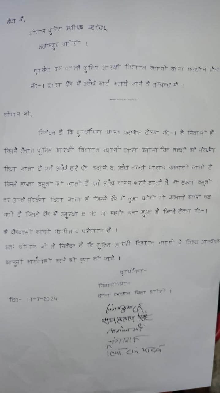 लखीमपुर खीरी। (परिपाटी न्यूज)थाना फरधान में कई वर्षो से एक ही हल्का में तैनात आरक्षी विशाल त्यागी पर क्षेत्र में पेड़ कटाने, जुआ खिलवाने अवैध कच्ची शराब बनवाने समेत कई आरोप लगाते हुए ग्रामीणों ने एसपी खीरी को शिकयती दिया है। क्षेत्र की सुरक्षा को देखते हुए शिकायती पत्र देते हुए आरक्षी विशाल का हल्का चेंज कराने की मांग की है। ग्रामीणों का आरोप है आरक्षी विशाल त्यागी लगातार एक ही हल्का में कई वर्षो से तैनात है। क्षेत्र के संभारांत लोगो ग्राम प्रधान, बीडीसी व बुजुर्ग लोगों से अभद्रता से बात करता है।