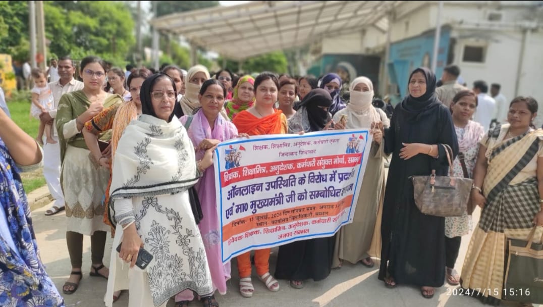 और जब तक यह कार्य पूर्ण नहीं होता समान कार्य समान वेतन के आधार पर मानदेय निर्धारित किया जाए ।संयोजक विकास यादव ने बताया कि समस्याओं के निस्तारण ना होने की स्थिति में शिक्षक,शिक्षा मित्र,अनुदेशक,कर्मचारी संयुक्त मोर्चा उ0प्र0अपने समस्त घटक संगठनों के साथ 29 जुलाई 2024 को महानिदेशक कार्यालय प्रांगण लखनऊ में व्यापक धरना प्रदर्शन हेतु विवश होगा।और समस्याओं का समाधान ना होने की स्थिति में धरना प्रदर्शन अनिश्चितकालीन के लिए बढ़ाया जा सकता है ।अंजू शर्मा एवम् अमीर जहाँ तुर्की ने कहा कि शिक्षकों की कर्तव्यनिष्ठा पर संदेह कर अपमानित करने की कोशिश की जा रही है ।पिछ्ले एक दशक से बेसिक शिक्षकों की जायज समस्याओं को भी अनसुना किया जा रहा है ।प्रह्लाद यादव ने बताया कि यदि विभाग वास्तव में बुनियादी शिक्षा और निपुण भारत के लक्ष्य के प्रति गंभीर है तो बेसिक शिक्षकों की कठिनाइयों तथा समस्याओं को भी समझना होगा ।सेवाराम दिवाकर ने कहा कि शिक्षकों को गैर शैक्षणिक कार्यों से मुक्त किया जाए ।प्रदीप चौधरी एवम् सुभाषचंद्र ने बताया कि समस्त संगठन एकमत हैं ।धरने का संचालन सतेंद्र सिंह तथा नईमुद्दीन अली ने किया ।विरोध प्रदर्शन में रविन्द्र खारी, रुचि गोयल,अलका सिंह,डा0राजू गुप्ता,सुखवीर सिंह,अभिषेक बंसल,अविनाश कुमार,सतेंद्र सिंह,फरमान हुसैन,अतुल शर्मा,राखी,सन्देश चौधरी,सचिन शर्मा,चन्द्रकांता,साक्षी शर्मा,मन्जूषा,दीपक गोस्वामी,रतनिका,पंकज सक्सेना,हरिओम,हफीज,पराग मिश्रा,ऋषभ,शालिनी सक्सेना,पूनम ,रवीना,जयप्रकाश,देवेन्द्रसिंह,चंद्रप्रकाश,प्रवीण कुमार,उमर,नरेन्द्र शर्मा,प्रदीप कुमार,गौरव मिश्रा,अनिल कपूर,चौहान सिंह,नवनीश पटेल,राजीव कुमार,रूबी,शालू,राजेन्द्र सिंह,सुबोध कुमार,उमेश कुमार सौली,कालाराम सहित हजारों की संख्या में शिक्षक शिक्षा मित्र,अनुदेशक,विरोध प्रदर्शन एवम ज्ञापन में सम्मिलित हुए।