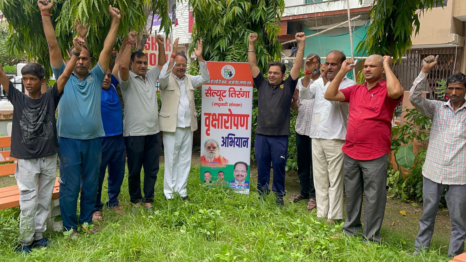 में केवल 28 का है हम लोग स्कूल में केवल बसते लेकर के जाया करते थे हमारे सामने की पीढ़ी पानी की बोतल लेकर के जा रही है और अब वह दिन दूर नहीं है जब हमारे आने वाली पीढ़ी ऑक्सीजन का सिलेंडर साथ में लेकर के जाया करेगी, ऑक्सीजन की निरंतर कमी होने के कारण से प्राण वायु में संकट आ रहा है जिसके कारण से हार्ट की बीमारी बढ़ती जा रही है हार्ट ब्लॉकेज होते जा रहे हैं सांस की बीमारी बढ़ती जा रही है व्यक्ति को शुद्ध वायु नहीं मिल पा रहा है पर्यावरण प्रदूषण होता जा रहा है, दुनिया की सभी प्रकार की समस्याओं का समाधान केवल पेड़ लगाना ही है कुछ भी दुनिया में खरीदा जा सकता है परंतु शुद्ध प्राण वायु ऑक्सीजन खरीदी नहीं जा सकती इसको बनाने की फैक्ट्री एकमात्र पेड़ ही है इसलिए पेड़ खूब लगाना चाहिए इस अवसर पर सैल्यूट तिरंगा कार्यकर्ताओं ने भारत माता की