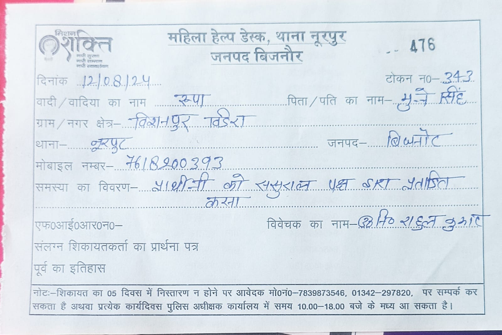 थाना क्षेत्र के ग्राम बिशनपुरा बिडरा निवासी मुन्ने सिंह ने दो साल पहले अपनी पुत्री की शादी रिती रिवाज के साथ रोहित पुत्र कल्लू सिंह सैनी निवासी मोहल्ला सरगम (चांदपुर) जिला बिजनौर के साथ की थी। शादी में उन्होंने मोटरसाइकिल, सोने चांदी के आभूषण सहित दहेज का लगभग सभी सामान दिया गया था। पुलिस को दी गयी तहरीर में पीड़िता ने बताया कि मेरे पिता द्वारा दिये गये