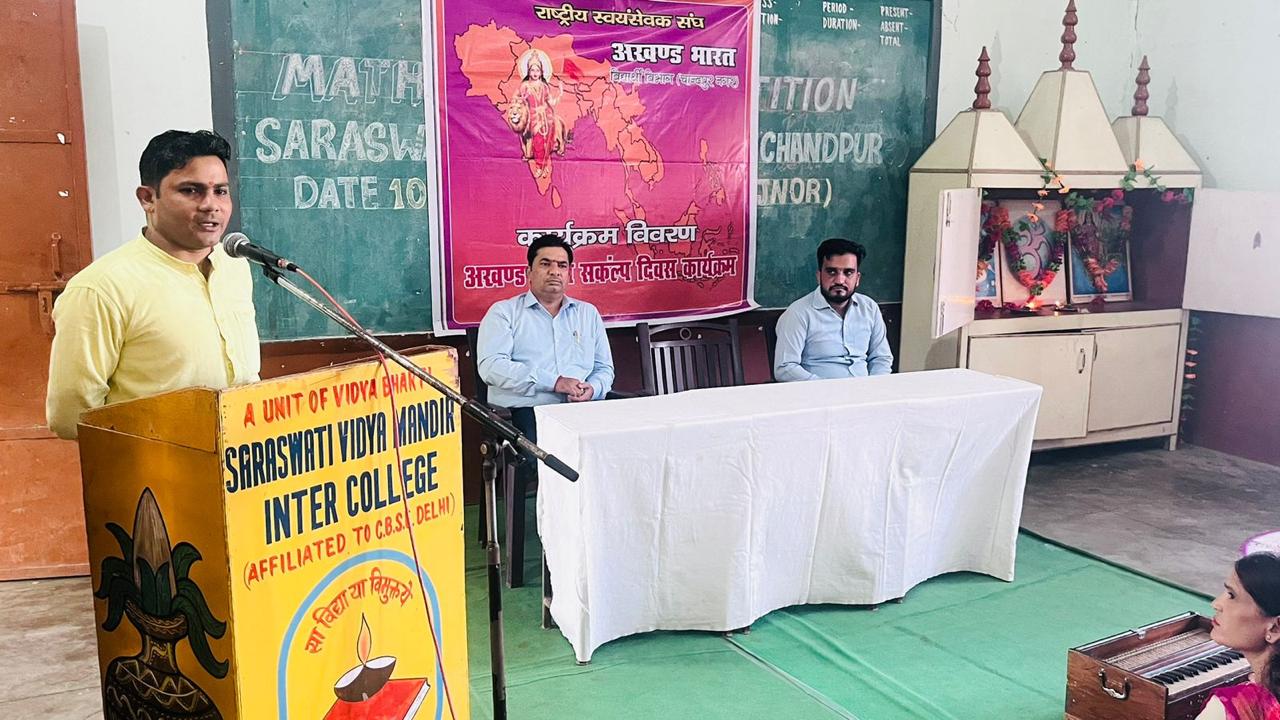 बिजनौर(परिपाटी न्यूज)। सरस्वती विद्या मंदिर इंटर कॉलेज चांदपुर में अखंड भारत संकल्प दिवस का कार्यक्रम मनाया गया।