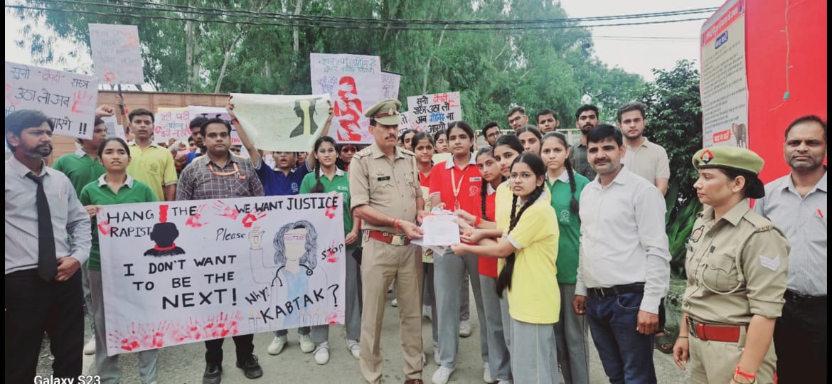 नूरपुर, बिजनौर (परिपाटी न्यूज़) कोलकाता में महिला डॉक्टर की रेप के बाद हत्या के विरोध में आर आर पब्लिक स्कूल के बच्चों ने नगर में विरोध प्रदर्शन कर मार्च निकाला तथा दोषियों के खिलाफ कड़ी से कड़ी कार्यवाही करने की मांग को लेकर भारत के प्रधानमंत्री नरेंद्र मोदी के नाम नूरपुर थानाध्यक्ष को एक ज्ञापन दिया गया।मंगलवार को स्योहारा रोड़ स्थित आर आर पब्लिक स्कूल के छात्रों ने कोलकाता में महिला डॉक्टर के साथ हुई घटना को लेकर नारेबाजी करते हुए भारी संख्या में विरोध प्रकट किया । प्रधानाचार्य प्रणय मनु गुप्ता के नेतृत्व में विद्यालय के शिक्षकों व स्कूली बच्चों ने यह