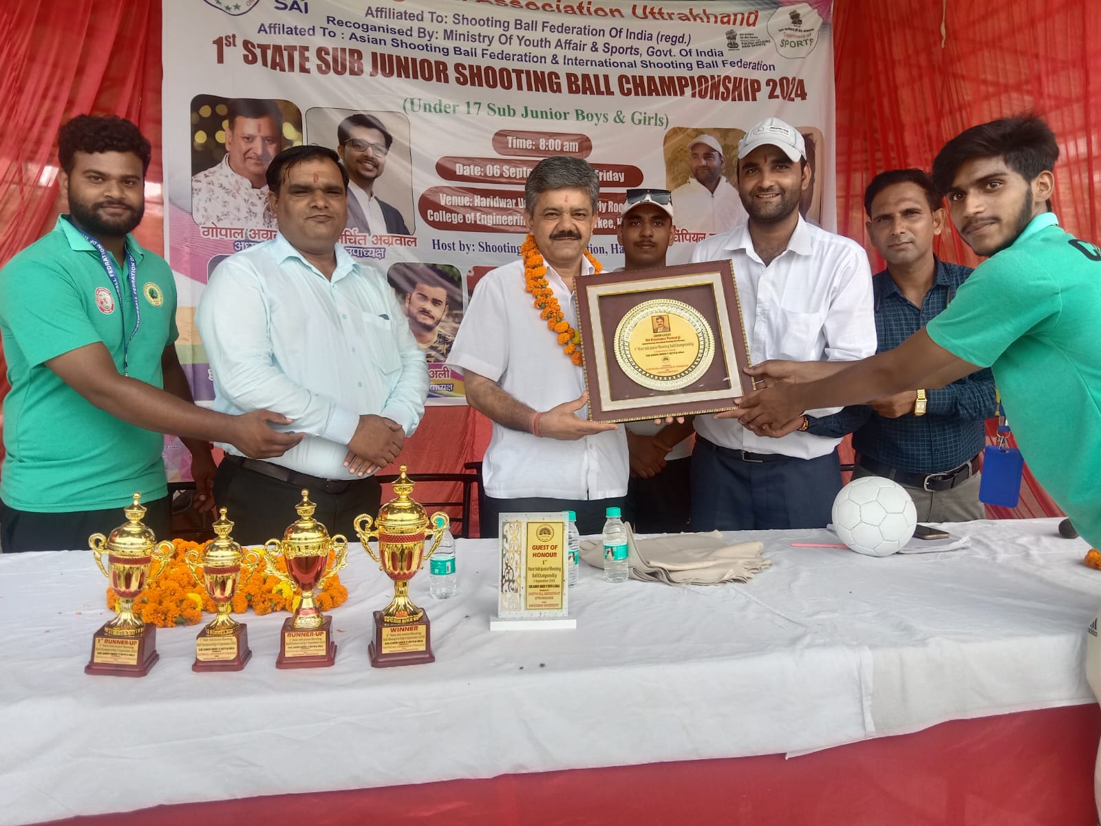 जनरल सेक्रेटरी इंटरनेशनल शूटिंग बॉल फेडरेशन रविंद्र तोमर एवं विशिष्ट अतिथि काउंसलर हरिद्वार यूनिवर्सिटी एस के गुप्ता,रजिस्ट्रार लेफ्टिनेंट सुमित,अतुल तोमर,दिनेश शर्मा ने खिलाड़ियों को मेडल,प्रमाण पत्र एवं ट्रॉफी भेंटकर सम्मानित किया गया। मुख्य अतिथि रविंद्र तोमर जी ने बताया कि पिछली प्रतियोगिता में उत्कृष्ट प्रदर्शन के आधार पर खिलाडी सरकारी सेवा में स्थान पा चुके हैं।सभी खिलाड़ी नेशनल स्तर से इंटरनेशनल स्तर पर प्रतिभाग कर देश का नाम रोशन करेंगेlउत्तराखंड शूटिंग बॉल एसोसिएशन की ओर अल्मोड़ा,टिहरी गढ़वाल,चंपावत,बागेश्वर, उत्तरकाशी, हरिद्वार ,रुद्रप्रयाग, देहरादून, पौड़ी गढ़वाल के टीमो के खिलाड़ियों ने प्रतिभाग किया।शूटिंग बॉल एसोसिएशन उत्तराखंड के अध्यक्ष गोपाल अग्रवाल ने विजेता एवं उपविजेता टीम के खिलाड़ियों को शुभकामनाएं दी।शूटिंग बॉल एसोसिएशन उत्तराखंड के उपाध्यक्ष डॉ रजनीश सैनी,डॉ अर्चित अग्रवाल,कोषाध्यक्ष डॉ गौरव अग्रवाल,सचिव चैंपियन सूरज रोड,सह सचिव आशीष राष्ट्रवादी,सोशल मीडिया प्रभारी कबीर अहमद,सदस्य वीरेंद्र चौहान,नीरज कुमार,सेम अली,धीरज सिंह,अभिषेक,सात्विक सैनी,तनु शर्मा,नीरज सिंह,विशाल सैनी उपस्थित रहे।