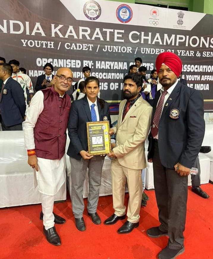 हरिद्वार परिपाटी न्यूज। ऑल इंडिया कराटे चैंपियनशिप ओलंपिक भवन के देवी लाल स्टेडियम पंचकुला हरियाणा में कराटे चैंपियनशिप आयोजित की गई।जिसमें देश के लगभग 3000 प्रतिभागियों ने भाग लिया।इस चैंपियनशिप में कराटे कॉम्बैट जिम,पानीपत कराटे कॉम्बैट अकादमी में प्रशिक्षण दे रही। उत्तराखंड के जिला हरिद्वार से भोगपुर निवासी महिला कोच निर्वेश सैनी को कराटे कॉम्बैट जिम के निदेशक परमजीत सिंह,महासचिव योगेश कालरा,कराटे एसोसिएशन ऑफ इंडिया के अध्यक्ष बैकुंठ सिंह और साई ब्रूस तमिल से कराटे एसोसिएशन ऑफ इंडिया के चेयरमैन के द्वारा दान ग्रेड,काई कोच लाइसेंस,काई राष्ट्रीय स्तर जज बी आधिकारिक प्रमाणिकता प्रमाण पत्र एवं मोमेंटो भेंटकर सम्मानित किया गया।कुमारी निर्वेश सैनी ने अपने पिता