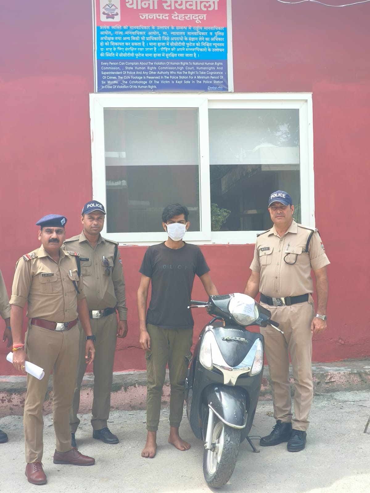 तरफ दुपहिया वाहन से आता हुआ दिखाई दिया जो पुलिस टीम को देख कर वापस मुड़ने का प्रयास करने लगा तथा भागने पर अनियन्त्रित होकर सडक पर गिर गया। पुलिस टीम के द्वारा एकदम से बिना देर किये उक्त लड़के को मौके पर ही पकड़ लिया। पकडे गए व्यक्ति ने अपना नाम क्षितिज शर्मा पुत्र मनोज शर्मा निवासी रामविहार कॉलोनी हरिपुर कलां थाना रायवाला जनपद देहरादून उम्र 23 वर्ष बताया । पकड़े गए व्यक्ति से भागने का कारण पूछा तो इसने बताया कि मेरे पास चोरी की स्कूटी है यह स्कूटी दिनांक 15-16/09/2024 की रात्री मे 12.00-01.00 बजे के मध्य गली न0 5 बिरला फार्म के पास एक घर के सामने से चोरी की थी। जिसे मैने हाथी गली के पास अन्दर झाडियो मे रेलवे ट्रेक के पास छिपा दिया था। नाम पता अभियुक्त, क्षितिज शर्मा पुत्र मनोज शर्मा निवासी रामविहार कॉलोनी हरिपुर कलां थाना रायवाला जनपद देहरादून उम्र 23 वर्ष सम्बन्धित मु0अ0स0 194/24 धारा 303(2) बीएनएस बनामअज्ञात, टीम सदस्यो के नाम, अपरउ0नि0 योगेन्द्र कुमार , हे0का0 307 राजीव कुमार ,का0 829 आनन्द सिहं , जिसे मैं अब अन्धेरे का फायदा उठाकर ठिकाने लगाने जा रहा था कि आपने पकड लिया । अभियुक्त व बरामद स्कूटी को पुलिस द्वारा हिरासत कब्जे मे लेकर थाना दाखिल कराया गया । अभियुक्त को समय से मा0 न्यायालय पेश किया जा रहा है ।