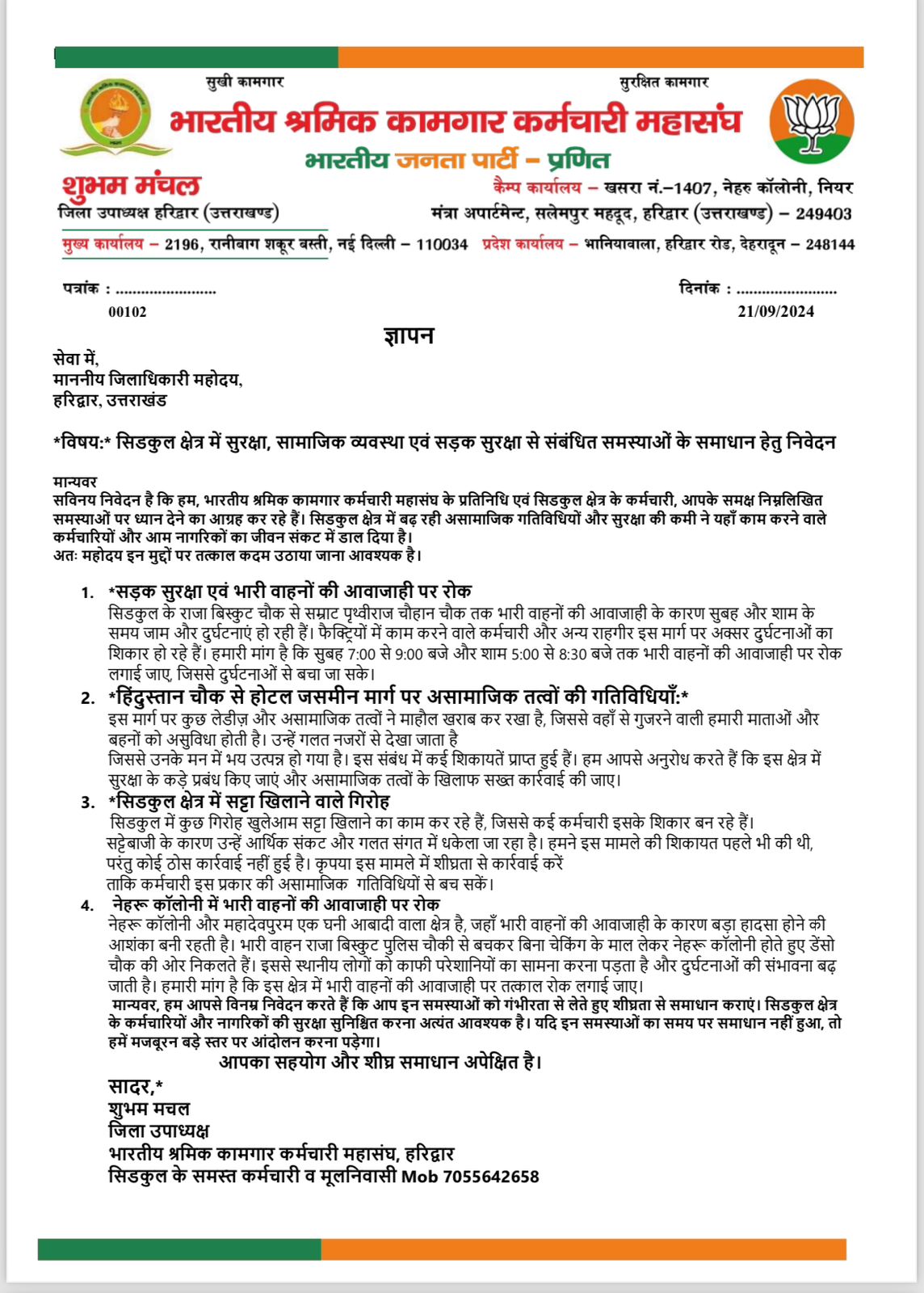 हरिद्वार परिपाटी न्यूज। सिडकुल क्षेत्र में बढ़ती असामाजिक गतिविधियों और सड़क सुरक्षा के गंभीर मुद्दों को लेकर भारतीय श्रमिक कामगार कर्मचारी महासंघ ने आज जिलाधिकारी को ज्ञापन सौंपा। महासंघ के जिला उपाध्यक्ष शुभम मचल के नेतृत्व में सिडकुल के कर्मचारियों और स्थानीय नागरिकों ने मिलकर इस ज्ञापन में विभिन्न समस्याओं पर ध्यान आकर्षित किया और उनके समाधान की मांग की। प्रमुख मांगे सड़क सुरक्षा सिडकुल के राजा बिस्कुट चौक से सम्राट पृथ्वीराज चौहान चौक तक भारी वाहनों की अनियंत्रित आवाजाही से सुबह और शाम के वक्त लगातार जाम और दुर्घटनाएं हो रही हैं। महासंघ ने मांग की है कि सुबह 7:00 से 9:00 बजे और शाम 5:00 से 8:30 बजे तक भारी वाहनों की आवाजाही पर रोक लगाई जाए। असामाजिक तत्वों की बढ़ती गतिविधियां हिंदुस्तान चौक से होटल जसमीन मार्ग पर कुछ