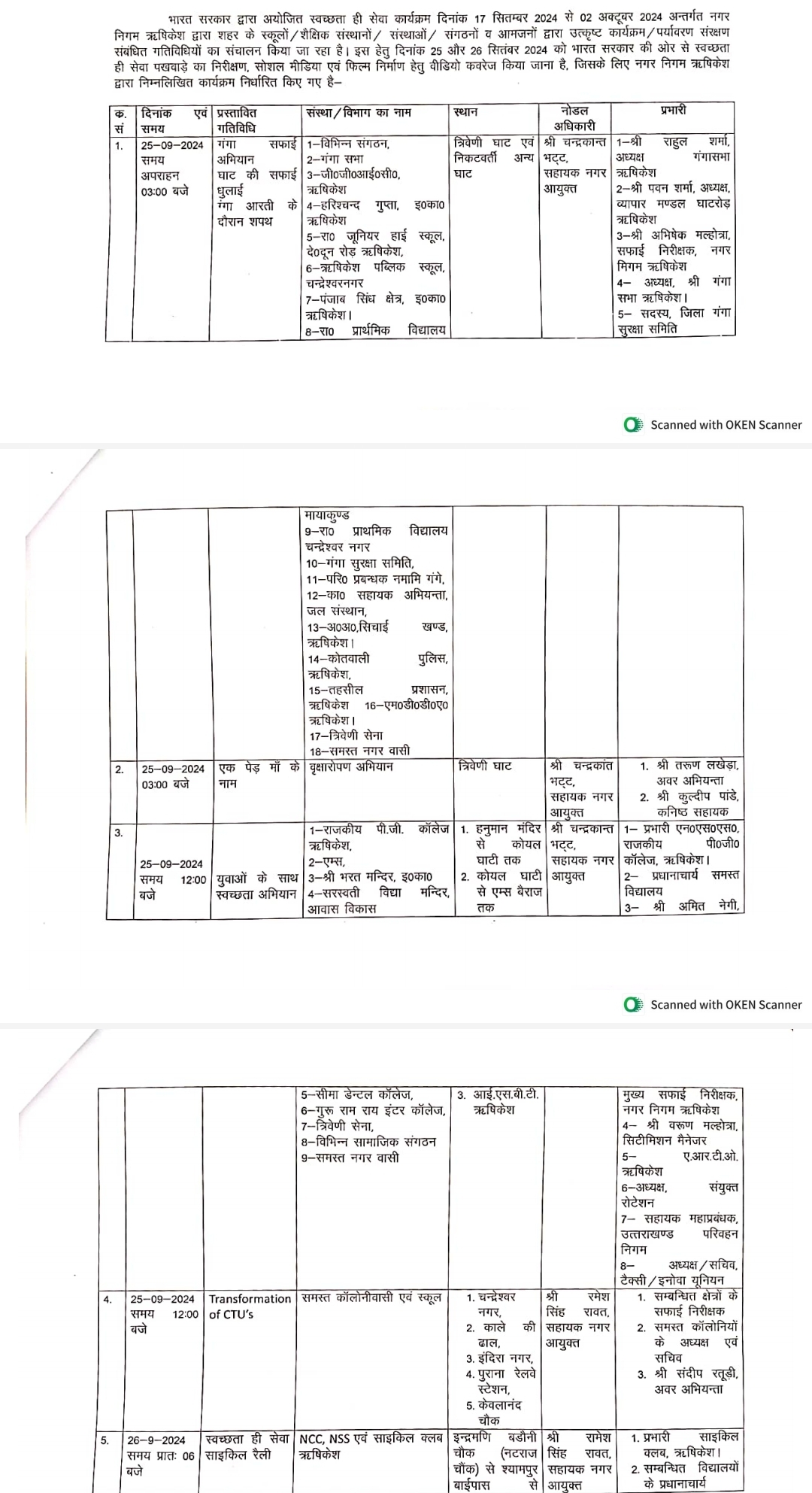 ऋषिकेश (परिपाटी न्यूज) कृपया अधिक से अधिक संख्या में कार्यक्रम के अनुसार उपस्थित होकर स्वच्छता ही सेवा पखवाड़ा को सफल बनाएं तथा ऋषिकेश को स्वच्छ और सुंदर बनाने में सहयोग दें। 1-गंगा सफाई अभियान ,दिनांक 25 सितंबर 2024 समय 10:00 बजे त्रिवेणी घाट विद्यालय के छात्र-छात्राएं एवं नगर वासीत्रिवेणी सेना 2-युवाओं के साथ सफाई अभियान हनुमान मंदिर से कोयल घाट कोयल घाटी से एम्स बैराज आईएसबीटी ऋषिकेश समय 12:00 बजे दिनांक 25 सितंबर 2024 राजकीय पीजी कॉलेज, एआई आईएमएस तथा इंटर कॉलेज की छात्र छात्राएं नगर वासीत्रिवेणी सेना 3- स्वच्छता ही सेवा साइकिल रैली, नटराज से श्यामपुर बाईपास- मार्केट -वापसी नटराज ,दिनांक 26 सितंबर 2024 समय प्रातः 6:00 बजे,NCC, NSS और साइकिल क्लब Rishikesh ,4- स्वच्छता ही सेवा चित्रकला प्रतियोगिता, दिनांक 26 सितंबर 2024, समय 10:00 बजे ,स्थान -राजकीय
