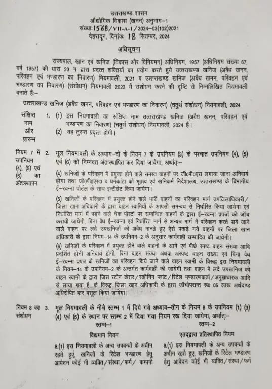 देहरादून (परिपाटी न्यूज) उत्तराखंड शासन ने खनन गतिविधियों पर नियंत्रण के लिए नई नियमावली जारी की है। यह नियमावली खान एवं खनिज (विकास और विनियमन) अधिनियम 1957 के तहत बनाई गई है, जिसका उद्देश्य अवैध खनन, भंडारण और परिवहन को रोकना है। नियमावली के अनुसार, खनिज परिवहन करने वाले सभी वाहनों पर GPS अनिवार्य किया गया