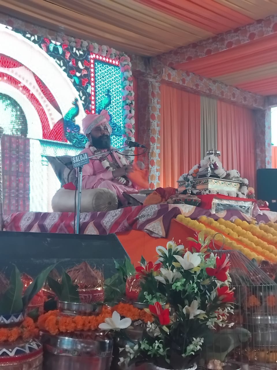 गंधर्व, मुरली भंडारी, राकेश राणा तथा रामविलास राव ने गणेश वंदना जय गणपति वंदन गणनायक तेरी छवि अति सुंदर सुखदायक के अलावा गुरु वंदना सतगुरु जी महाराज ने मो पे ऐसा रंग डाला शब्द की ज्योति जगी घट भीतर भीग गया तन सारा की प्रभावी प्रस्तुति एवं हनुमान चालीसा के सामूहिक उच्चारण से किया कथा के मुख्य यजमान नगर के समाजसेवी चिकित्सक डॉ ए के सक्सेना एवं उनकी धर्मपत्नी नीलम सक्सेना युवा समाजसेवी अभिषेक गुप्ता एवं उनकी धर्मपत्नी भावना गुप्ता ने उच्चरित हो रहे स्वस्तिवाचन के बीच व्यास पीठ का पूजन करके महामंडलेश्वर जी का आशीर्वाद ग्रहण किया, संकट मोचन श्री सिद्धेश्वर बालाजी धाम के संस्थापक एवं महंत राहुल अग्रवाल जी महाराज तथा आयोजन समिति के संयोजक लक्ष्मीकांत अग्रवाल एवं अध्यक्ष अशोक अग्रवाल होंडा महामंत्री मनोज रस्तोगी तथा कोषाध्यक्ष जगदीश लाल अरोड़ा के संयोजन में प्रारंभ हुए सात दिवसीय महोत्सव की समूची व्यवस्था की कमान नगर की धार्मिक संस्था श्रीमद् हनुमत भक्ति प्रचार मंडल के अध्यक्ष अरुण कुमार अग्रवाल एवं महासचिव मास्टर सुनील कुमार तथा कोषाध्यक्ष मनोज रस्तोगी के निर्देशन में रामप्रकाश वर्मा प्रीतम सिंह सैनी प्रवेश कुमार मिश्रा एवं उनके सहयोगियों ने संभाली हुई है इस मोके पर आयोजित सम्मान कार्यक्रम के अंतर्गत वरिष्ठ साहित्यकार दिनेश चंद्र अग्रवाल नवीन डॉक्टर एनपी सिंह महंत पीयूष अग्रवाल नरेश वत्स एलआईसी वाले डीबी सिंह टीकाराम जैन आदि को विशेष रूप से तैयार किए गए पटके पहना कर सम्मान प्रदान किया गया पहले दिन की कथा में महामंडलेश्वर श्री अमृतदास खाकी जी महाराज ने कहा कि प्रभु की कृपा के बिना कथा श्रवण करना तो दूर कथा स्थल तक आ पाना भी असंभव है उन्होंने मानव जीवन की प्राप्ति को भी प्रभु कृपा का परिणाम बताते हुए कहा कि यदि मानव जीवन में संतों का संग प्राप्त हो जाए तो जीवन का कल्याण हो जाता है उन्होंने श्रीमद् भागवत ग्रंथ को वेदव्यास जी महाराज का उत्कृष्ट ग्रंथ बताते हुए कहा कि जिसके माध्यम से भगवान कृष्ण के दर्शन हो जाए वही सच्चे मायने में भागवत है यदि कोई ग्रंथ आज समूचे विश्व में गर्जना कर रहा है तो वह केवल श्रीमद् भागवत ग्रंथ ही है पितृपक्ष में आयोजित कथा के लिए आयोजको को साधुवाद देते हुए कहा कि पितृ पक्ष के दौरान प्रत्येक सनातन परिवार को चाहिए कि वह अपने पितरों को जल अवश्य दे ऐसा होने पर पितरों को प्रसन्नता होती है अन्यथा जल न देने पर परिवार के लोगों को विपरीत परिस्थिति का सामना भी करना पड़ सकता है उन्होंने बताया कि एक जन्म नहीं बल्कि अनंत जन्मों का फल उदय होने पर ही भागवत कथा श्रवण करने का सौभाग्य प्राप्त होता है उन्होंने रामचरितमानस की चौपाई बिनु सत्संग विवेक न हो