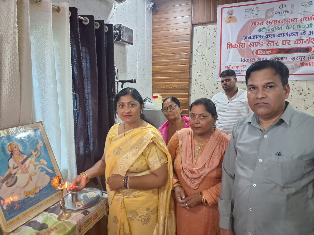 लिए अनेक जागरूकता कार्यक्रम चलाए जा रहे हैं ओर हम सब पूरी ईमानदारी के साथ काम करे आंगनवाड़ी कार्यकत्री का प्रथम कर्तव्य है कि वो एकजुट होकर काम की गुणवत्ता पर ध्यान दे आकांक्षा चौहान ने कहा कि मुझे खुशी होगी कि हमारे ब्लॉक नूरपुर में बाल विकास परियोजना प्रथम स्थान प्राप्त करे इस अवसर पर बाल विकास परियोजना अधिकारी सतीश कुमार, शारदा देवी ने भी विभाग की सभी योजनाओ पर प्रकाश डाला युवा चेतना नई सोच के संयोजक शुभम वालिया ने कहा कि आंगनवाड़ी कार्यकत्रियों का सभी सामाजिक कार्यों में सहयोग रहता है वे बधाई के पात्र हैं संगोष्ठी के बाद गर्भवती महिलाओ की गोदभराई, छ माह के बच्चो का अन्नप्राशन, स्वस्थ बालक बालिका स्पर्धा कार्यक्रम का आयोजन किया कार्यक्रम का कुशल संचालन आंगनवाड़ी कार्यकत्री उषा रानी ने किया कार्यक्रम में ग्राम प्रधान प्रतिनिधी शाहरुख फरीदी, रीना त्यागी, ममता शर्मा, सरिता देवी, नीतू, जसमेर कोर, विनेश देवी, विमला देवी, रूपवती त्यागी, सुरेखा देवी, आदेश कुमारी, रेखा रानी, गीता रानी, इंद्रेश त्यागी, पूनम देवी, सरोजबाला, सावित्री देवी, ललिता रानी, दुलारी देवी का सहयोग रहा।