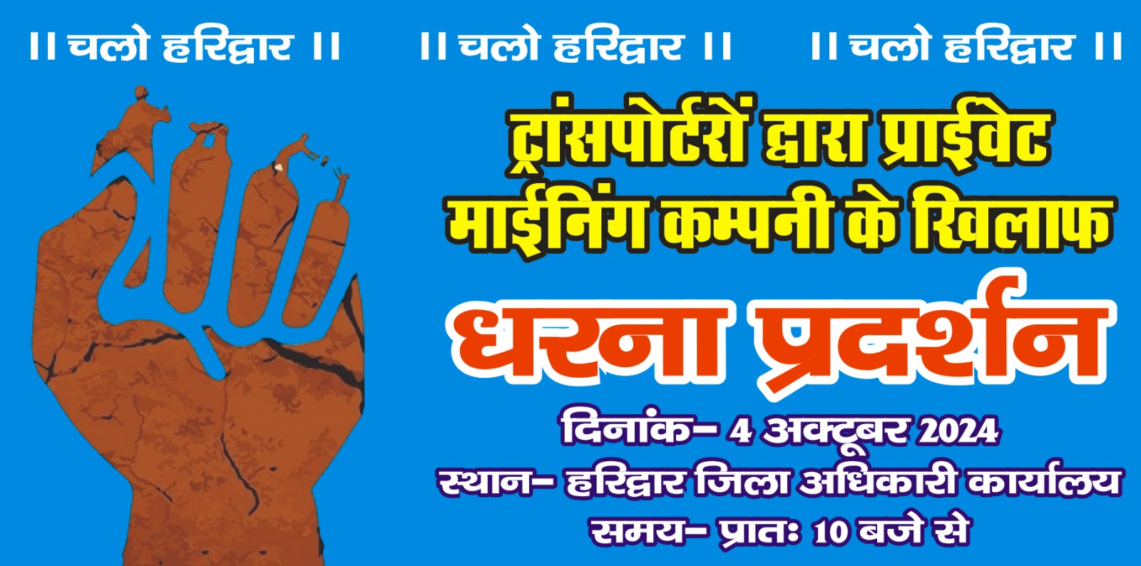 हरिद्वार (परिपाटी न्यूज) माइनिंग कंपनी रॉयल्टी कि दर ने खोलने एवं उनकी नीतियों का स्पष्ट न होने के कारण धरना प्रदर्शन । माइनिंग कंपनी अपने क्षेत्र में अपने सभी भंडारणों एवं खनिज पट्टों को रॉयल्टी मूल्य के साथ में सार्वजनिक करें जिससे खनन व्यापारी को सुविधा अनुसार खनन सामग्री उपलब्ध हो सके एवं खनन सामग्री का परिवहन कर सके। माइनिंग कंपनी के पोर्टल पर 70 टन तक रॉयल्टी काटने का प्रावधान है माइनिंग कंपनी के मानकों के अनुरूप खनन सामग्री का परिवहन करने पर शासन एवं प्रशासन अंडर लोड एवं ओवरलोड