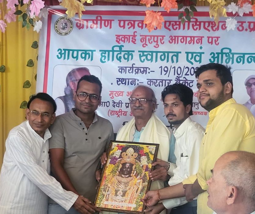 बिजनौर (परिपाटी न्यूज) नूरपुर उ॰प्र बिजनौर ज़िले के नूरपुर क़स्बे में अंतर्राष्ट्रीय वैश्य महासम्मेलन ज़िला बिजनौर ने ग्रामीण पत्रकार एसोसिएशन के राष्ट्रीय अध्यक्ष एवं अंतर्राष्ट्रीय वैश्य महासम्मेलन के राष्ट्रीय कार्यकारिणी सदस्य देवी लाल गुप्ता का स्वागत धूम धाम से किया । यह भव्य कार्यक्रम नूरपुर स्तिथ एक बैंक्वेट हॉल में ग्रामीण पत्रकार एसोसिएशन द्वारा किया गया । जिसमे आईवीएफ़ के ज़िला अध्यक्ष अभिनव