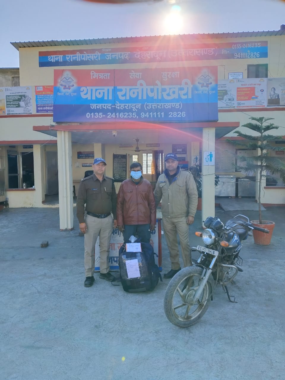 देहरादून (परिपाटी न्यूज) वरिष्ठ पुलिस अधीक्षक जनपद देहरादून द्वारा निर्गत निर्देशो के अनुक्रम में सभी थानो को अवैध शराब की विक्री व परिवहन करने वाले व्यक्तियो के खिलाफ प्रभावी कार्यवाही किये जाने के आदेश के अनुपालन में थाना रानीपोखरी पुलिस द्वारा कल दिनांक 20.12 .2024 चेैकिंग के दौरान जाखन नदी पुल एयरपोर्ट तिराहा के पास से 01अभियुक्त को 150 टैट्रा पैक मसालेदार देशी शराब माल्टा ब्राण्ड मय
